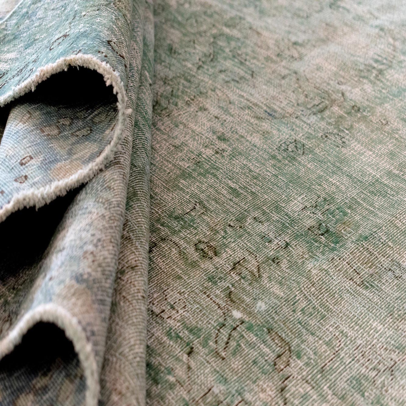 An 8x11 rectangular green Persian area rug with a vintage, distressed look and subtle traditional patterns.