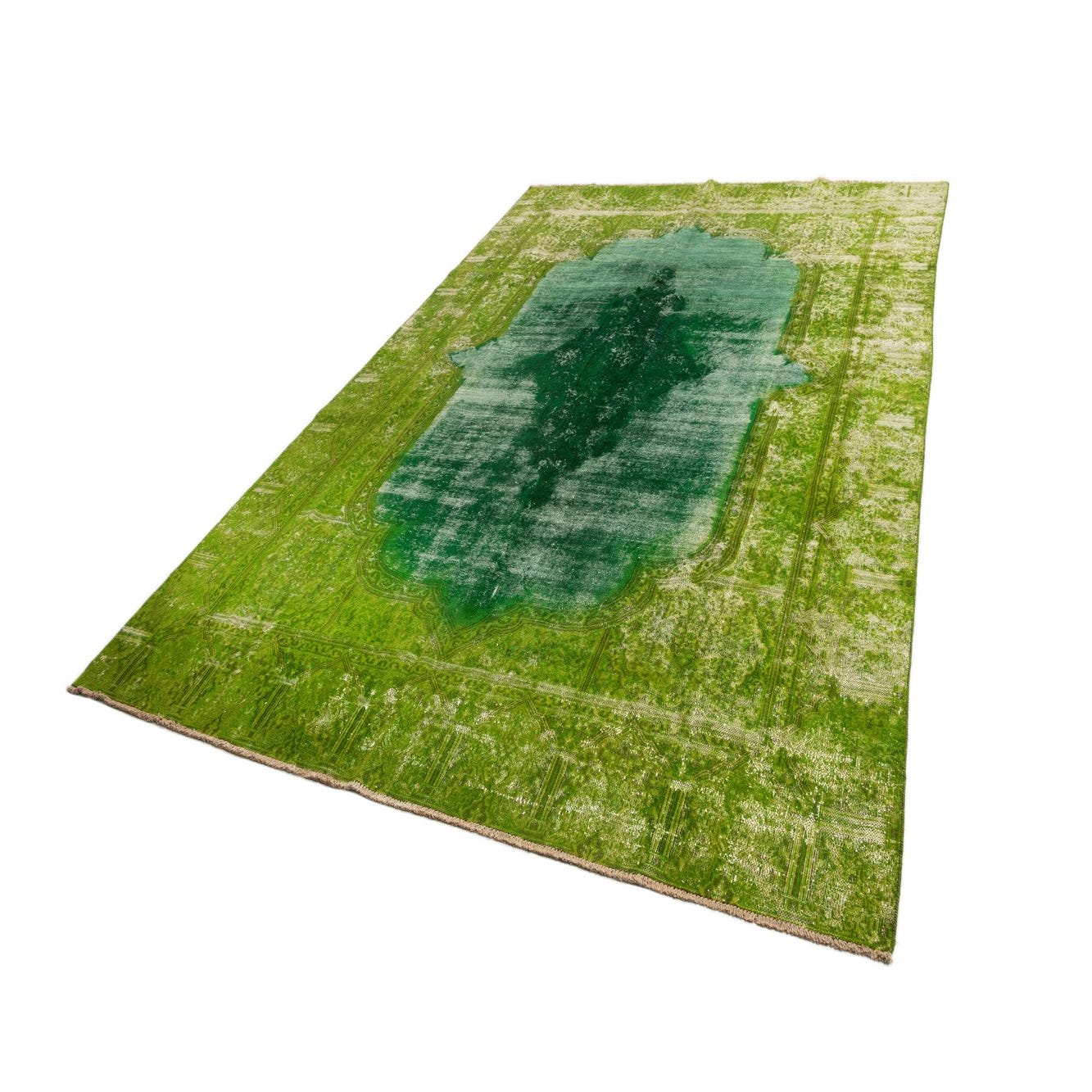 An 8x12 rectangular Vintage Royal Persian wool rug in varying shades of green, featuring a distressed traditional pattern.