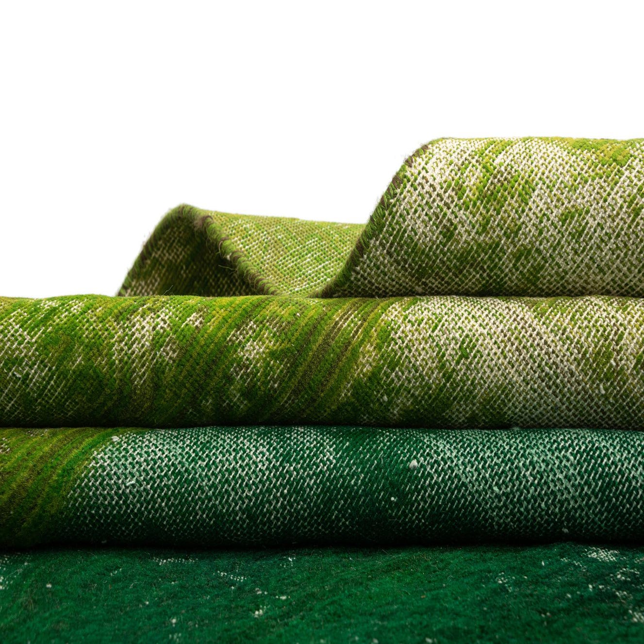 A vintage-inspired medallion balances a worn, lived-in surface with crisp architectural borders for a look that blends traditional detail and modern color. The field sits in a green wash that graduates from a misty aqua to a deep emerald at the central medallion, while distressed ivory highlights and faded floral motifs in the frame give the piece an aged, layered appearance. Hand made of wool, the weave has a gentle nap and a tactile, slightly uneven finish that invites you to run your hand across it and notice the subtle variations in pile and tone.