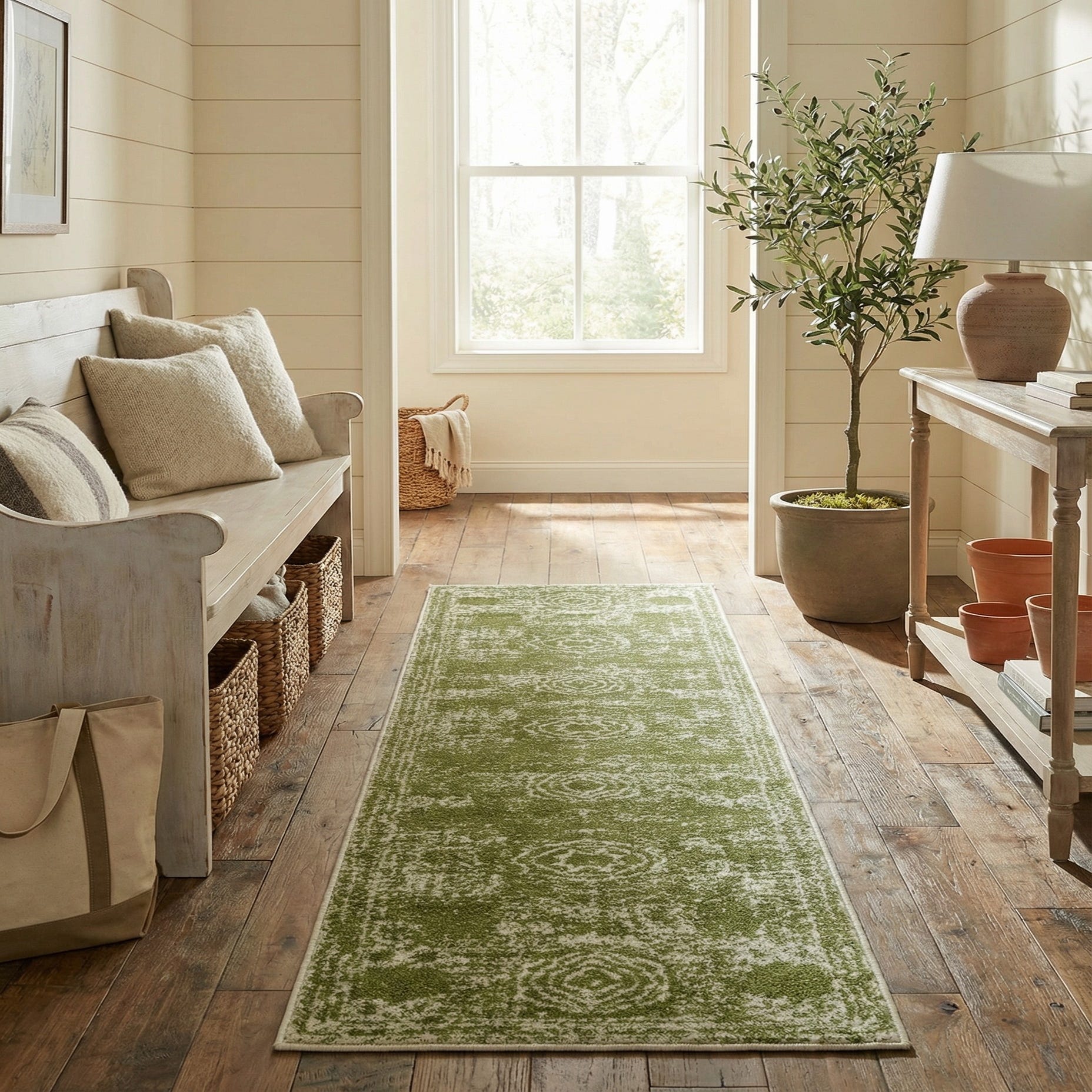 Being both stain-resistant and shed-free, this runner is a practical choice for high-traffic areas such as hallways or entryways. Its color palette and design make it versatile for various interior settings, blending seamlessly with modern, minimalistic, or even traditional decors. The runner's elongated shape is ideal for adding visual continuity to a space, guiding the eye through a home with a cohesive touch of style.