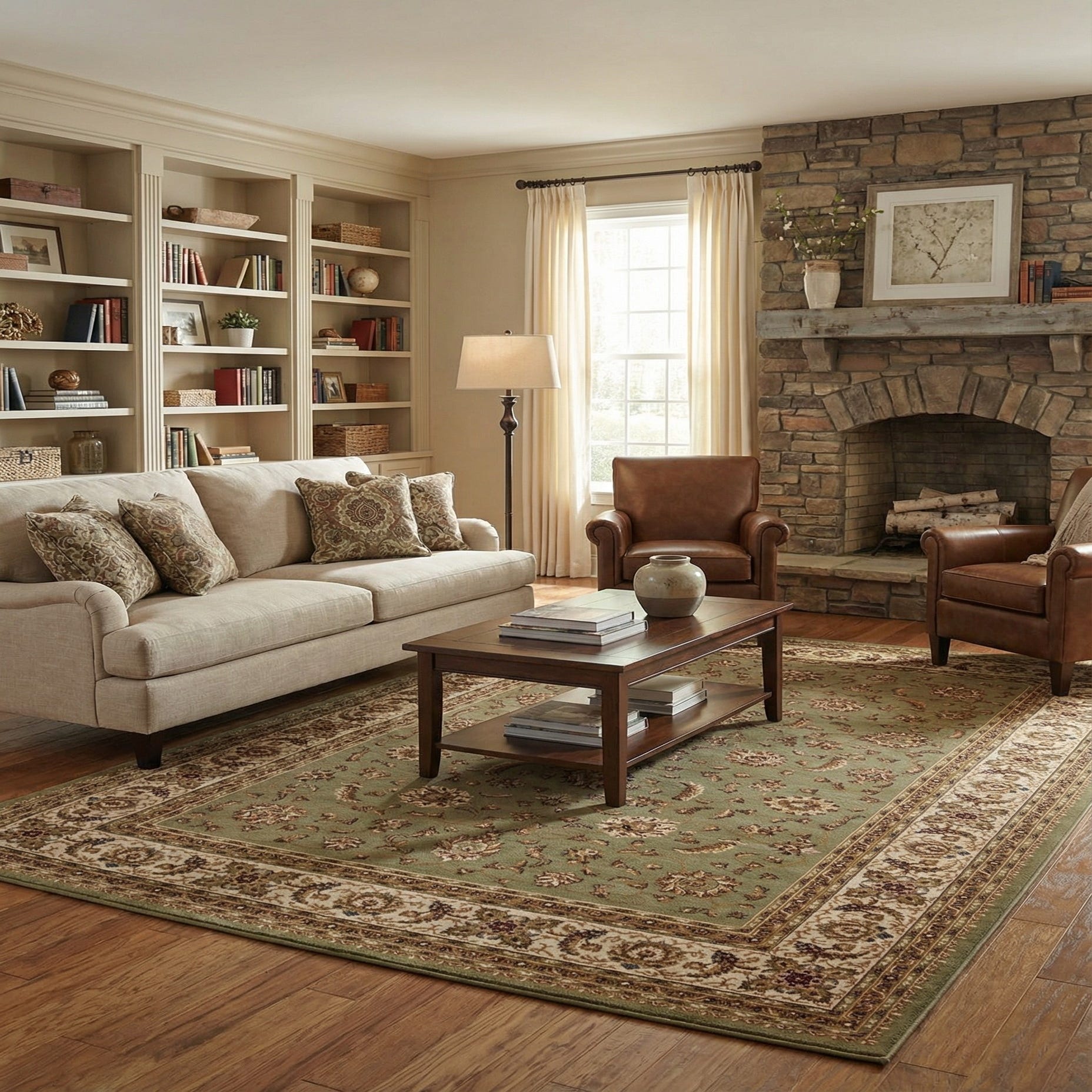A 9x12 rectangular Aditi rug in green with a traditional Oriental floral pattern and a detailed border.