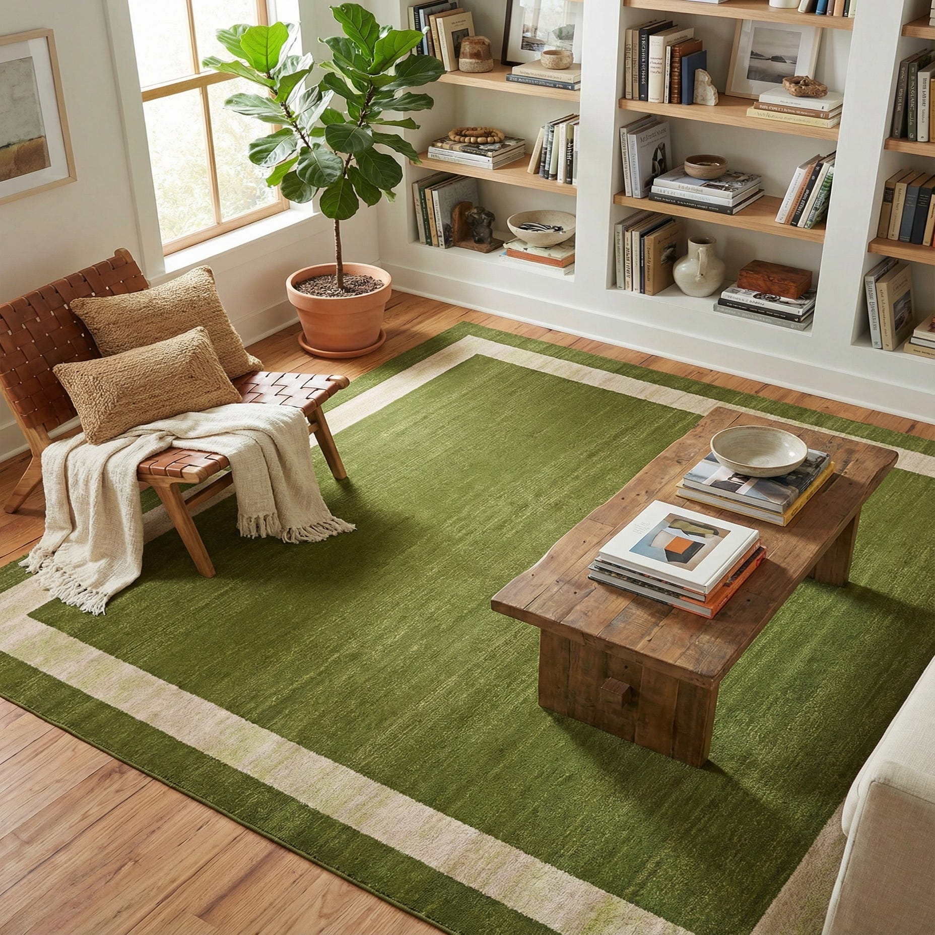 This rug presents a clean, modern bordered design with a rich green field and crisp ivory bands forming a double frame. The background color is green, with subtle tonal striations across the surface that add visual depth and a slightly variegated appearance. The simple geometry and restrained palette give it a contemporary, architectural look that remains versatile with different decor styles.