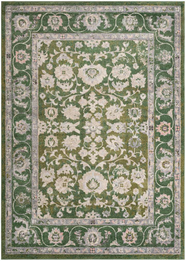 Primary color is Green. Colors in this rug include: Green, Gray, Ivory, Hunter Green, Pink.