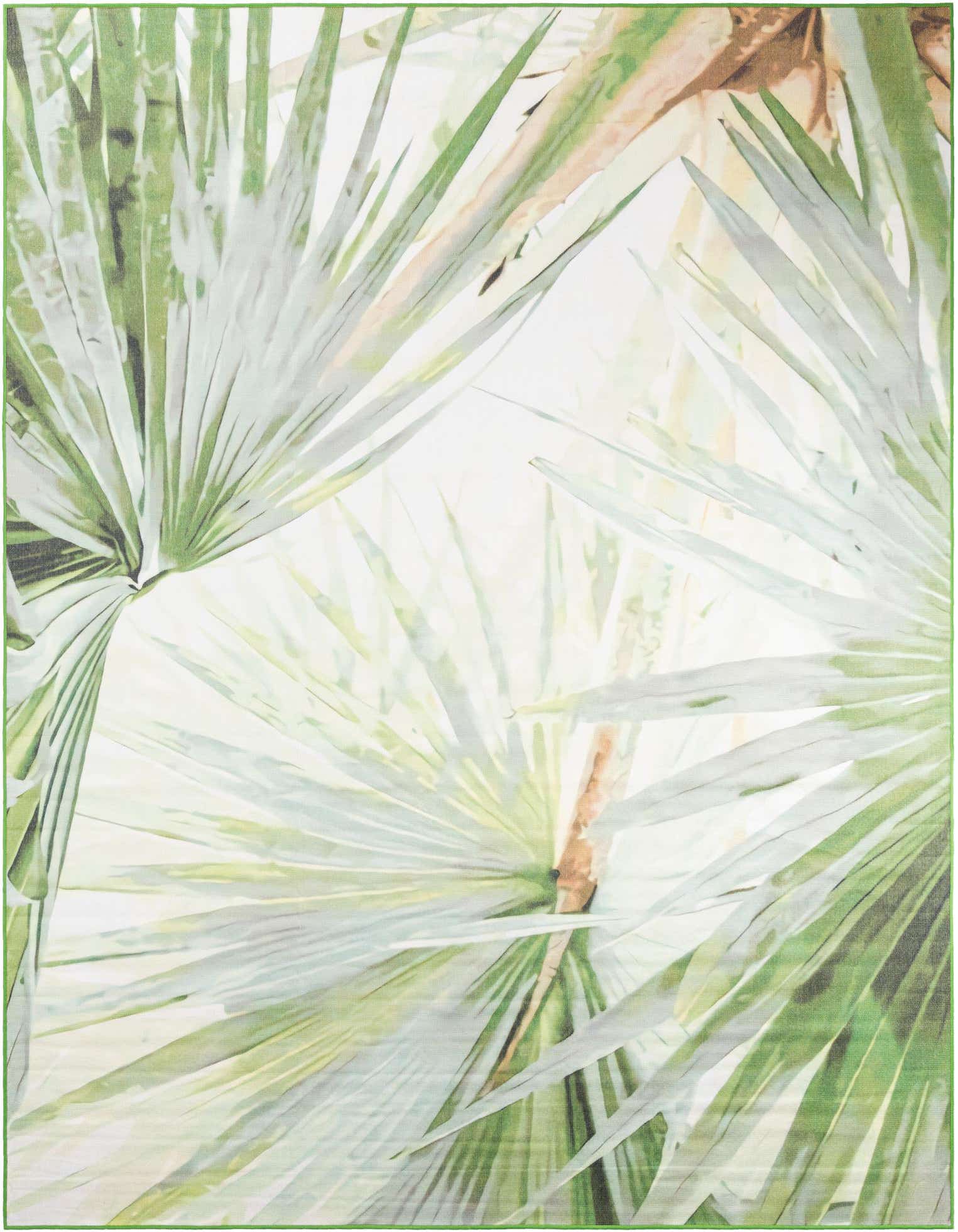 Featuring a botanical pattern, the design showcases a lush green background with light and olive green palm leaf motifs accented by touches of ivory, light brown, and black. This nature-inspired pattern brings an element of the outdoors into any living space, creating a serene and inviting atmosphere.