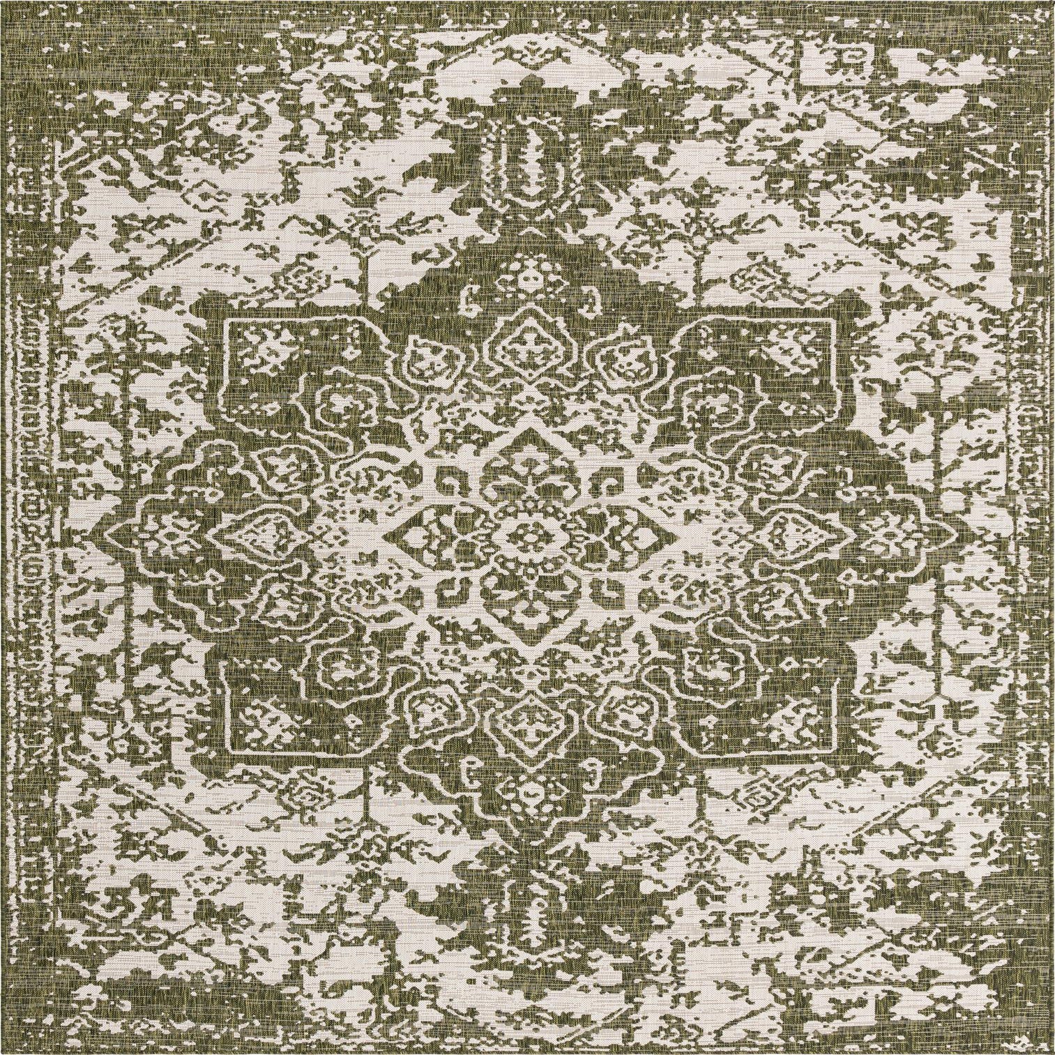 A classic central medallion and floral field are rendered in a vintage-inspired, distressed pattern across a green ground with ivory accents. The worn edges and scattered motifs create a relaxed, aged look while the contrast between the green background and ivory design remains clear and refined. The rug’s low-profile, tightly woven polypropylene surface has a subtle, ribbed texture that feels smooth underfoot and adds visual depth without bulk.