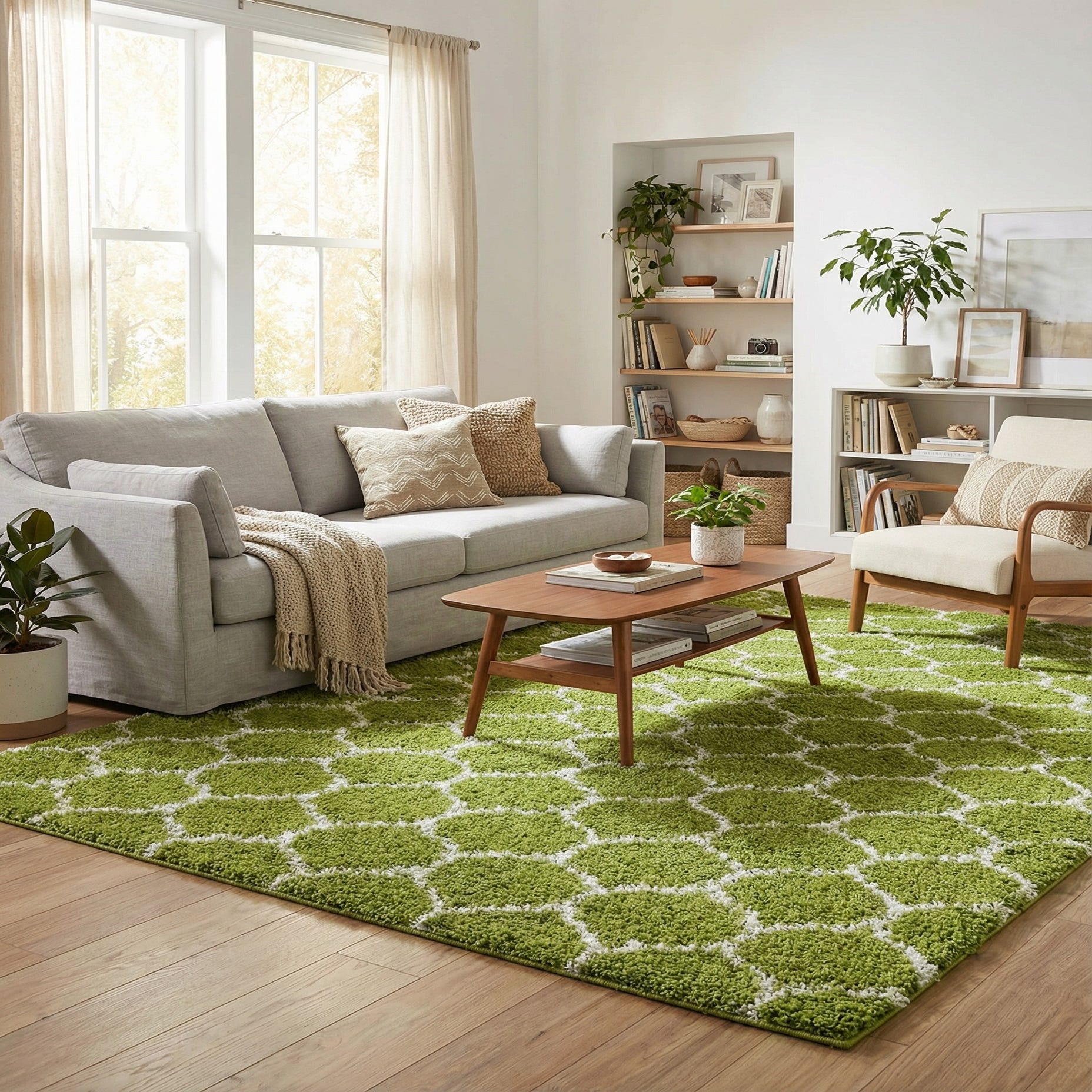 A plush, high-pile shag in a fresh green base is cut by an ivory lattice of rounded quatrefoil motifs, giving the surface a modern take on a classic trellis. The shag tufts rise above the shorter ivory loops, creating a tactile contrast you can feel when you run your hand across the rug—soft and springy underfoot while the patterned lines add subtle structure. Machine-made from 100% polypropylene, the rug maintains a consistent pile and a clean, defined pattern.
