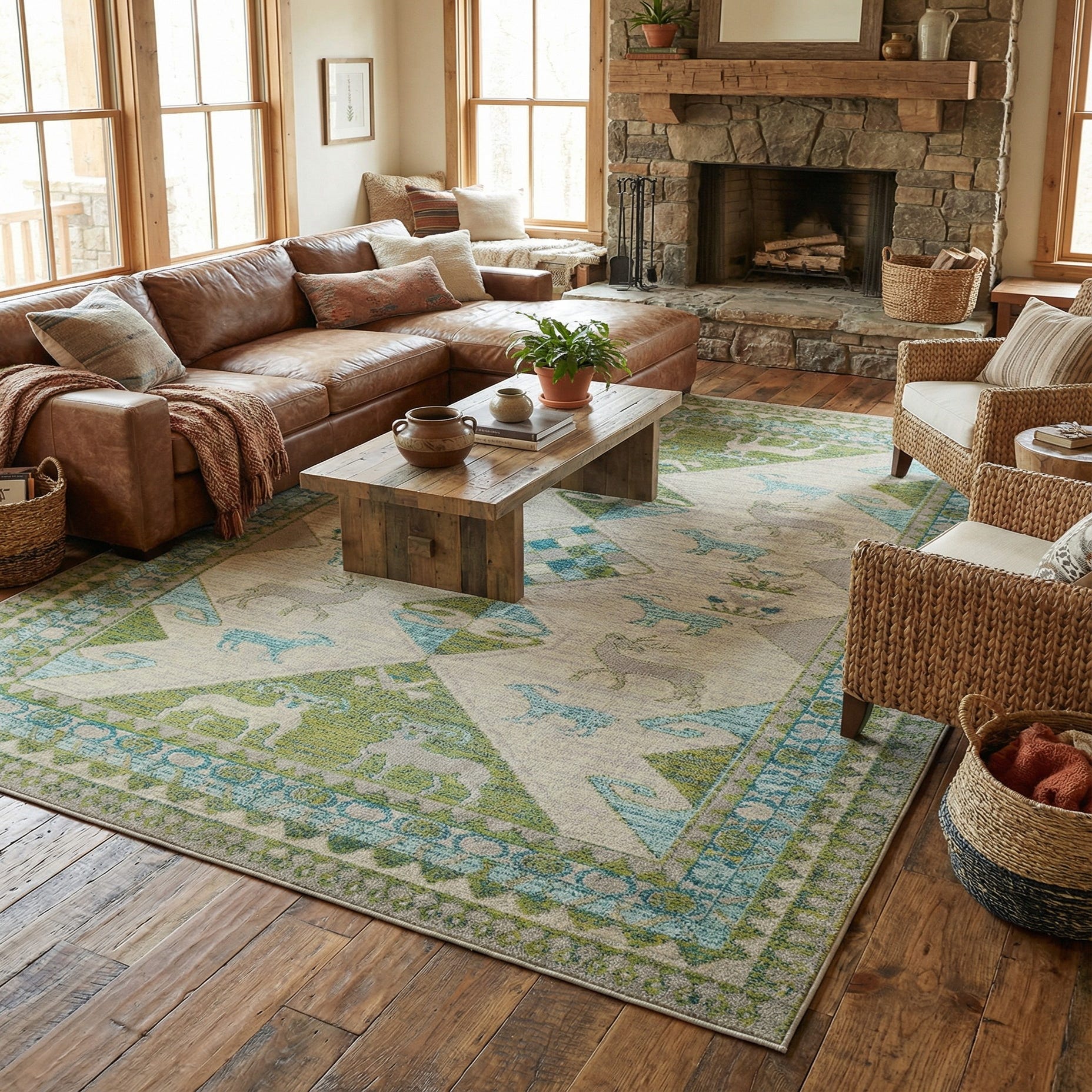 Primary color is Green. Colors in this rug include: Green, Gray, Ivory, Teal.
