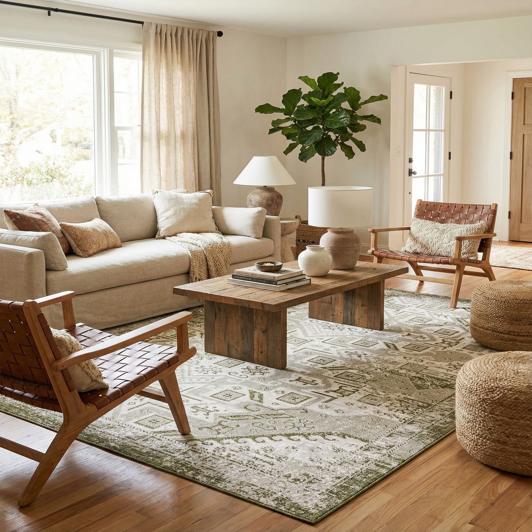 In terms of decor scenarios, this Outdoor Aztec rug would integrate seamlessly into a variety of settings, including patios, decks, and sunrooms thanks to its bold yet neutral hues. It can elevate the outdoors or bring a sense of nature to indoor settings, particularly complementing minimalist and bohemian interiors. The robust, elemental design would work well with natural wood, stone accents, and plants, enhancing an environment that embraces both organic elements and structured forms.