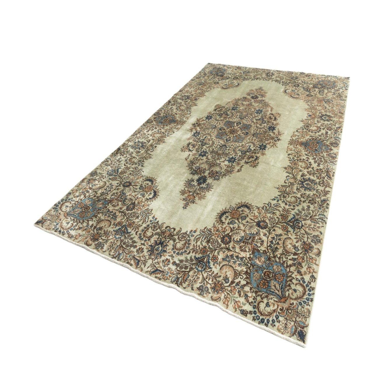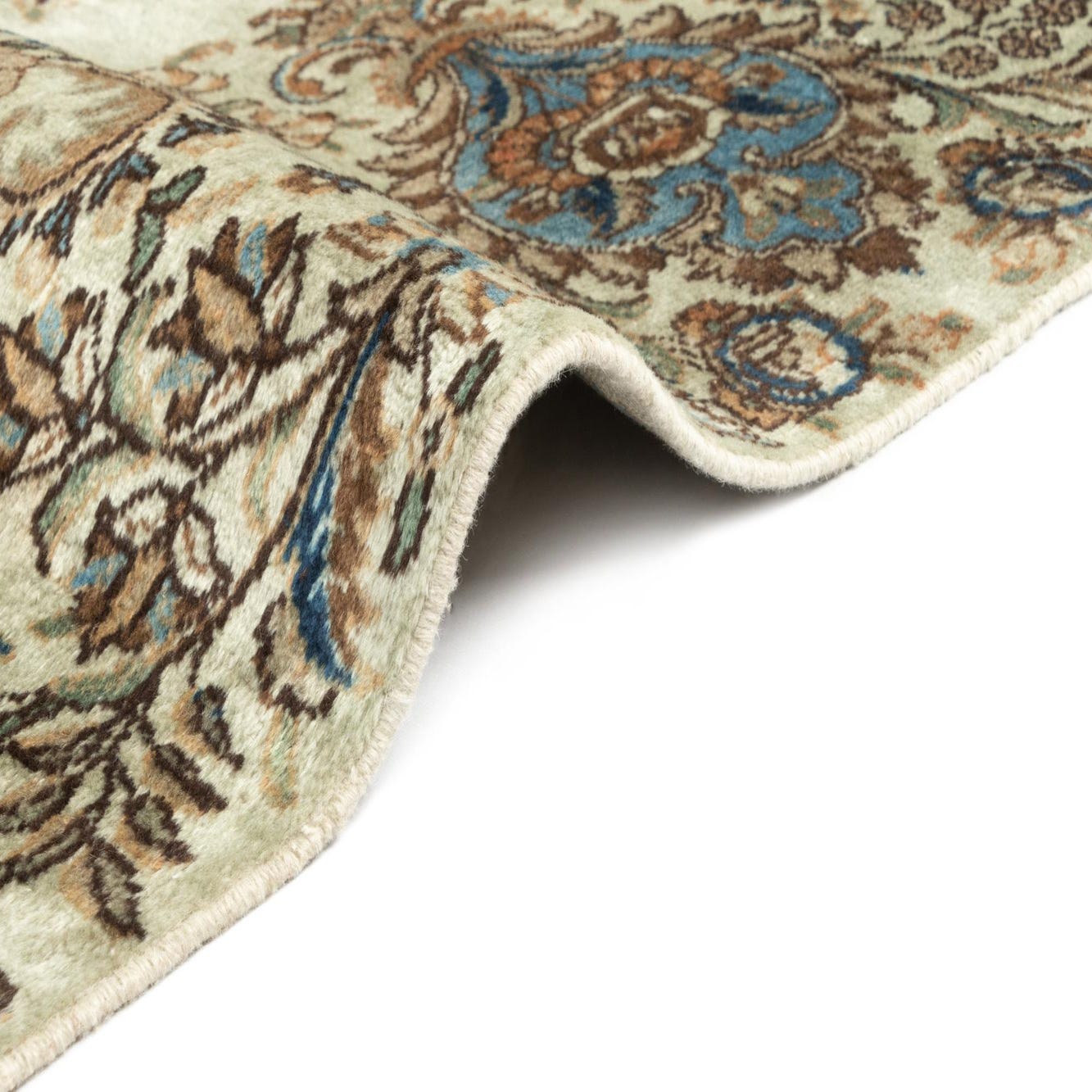 Primary color is Green. Colors in this rug include: Green, Olive, Cream, Brown, Blue.