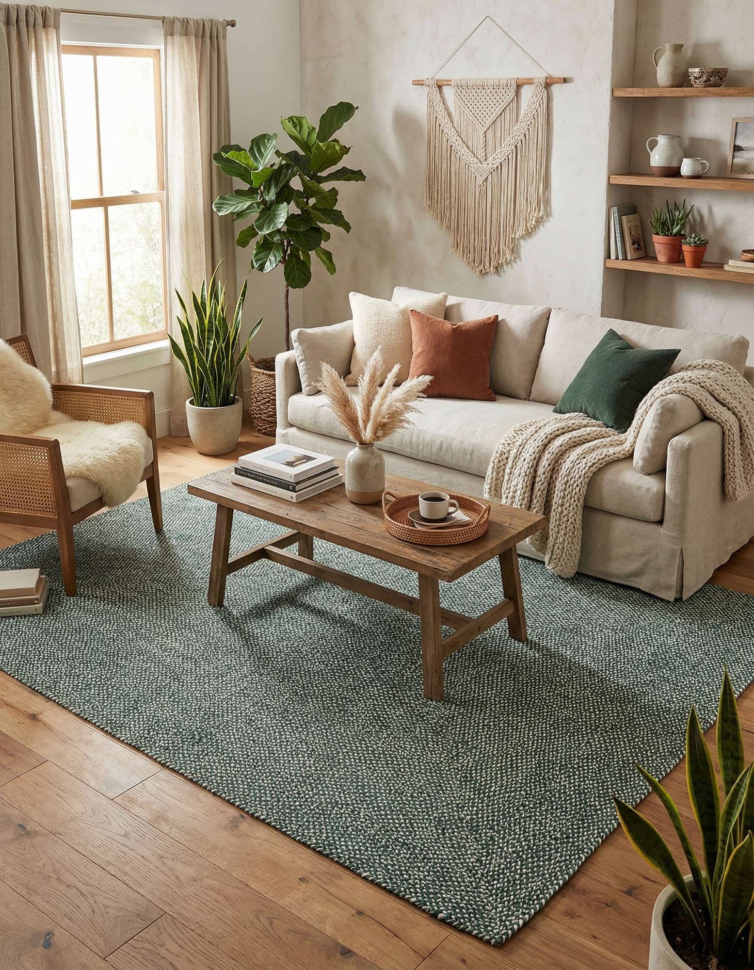 A 9x12 rectangular Rugs.com Tweed Braided Jute rug in a deep green, showcasing its textured, modern weave.