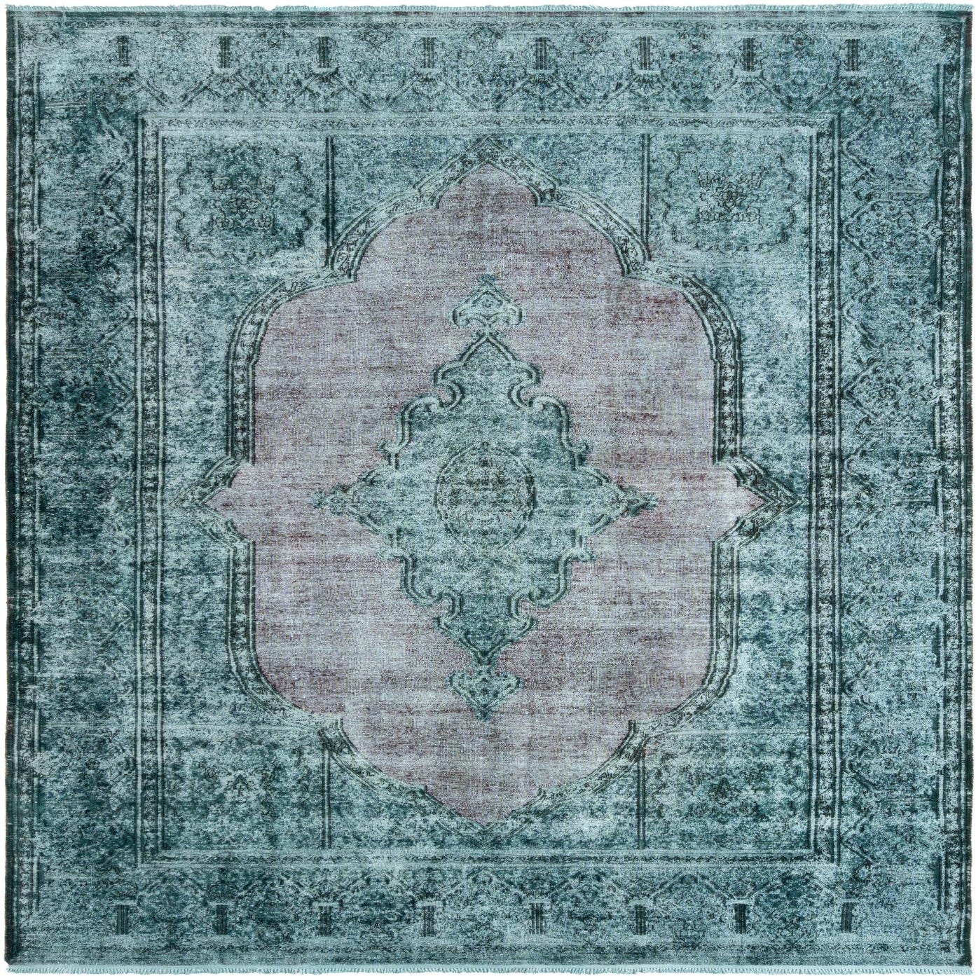 A 9x12 rectangular green Persian rug with a faded, distressed look and an ornate central medallion.
