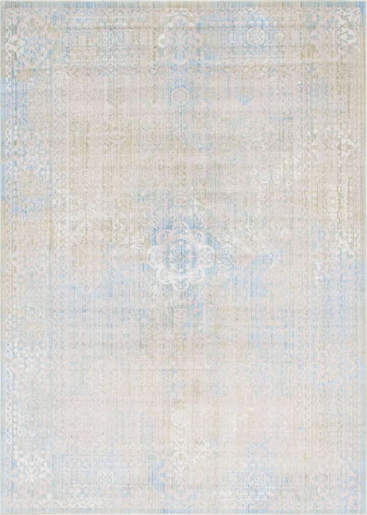 A softly faded medallion pattern rests on a green ground, with blue highlights and ivory tracery woven into the central motif and surrounding border. The design leans toward a vintage-inspired, softly distressed look—motifs are gently worn and color transitions are subtle, giving the rug a relaxed, layered appearance that still reads as composed. The green background anchors the palette while the blue and ivory accents add depth and a touch of cool contrast.