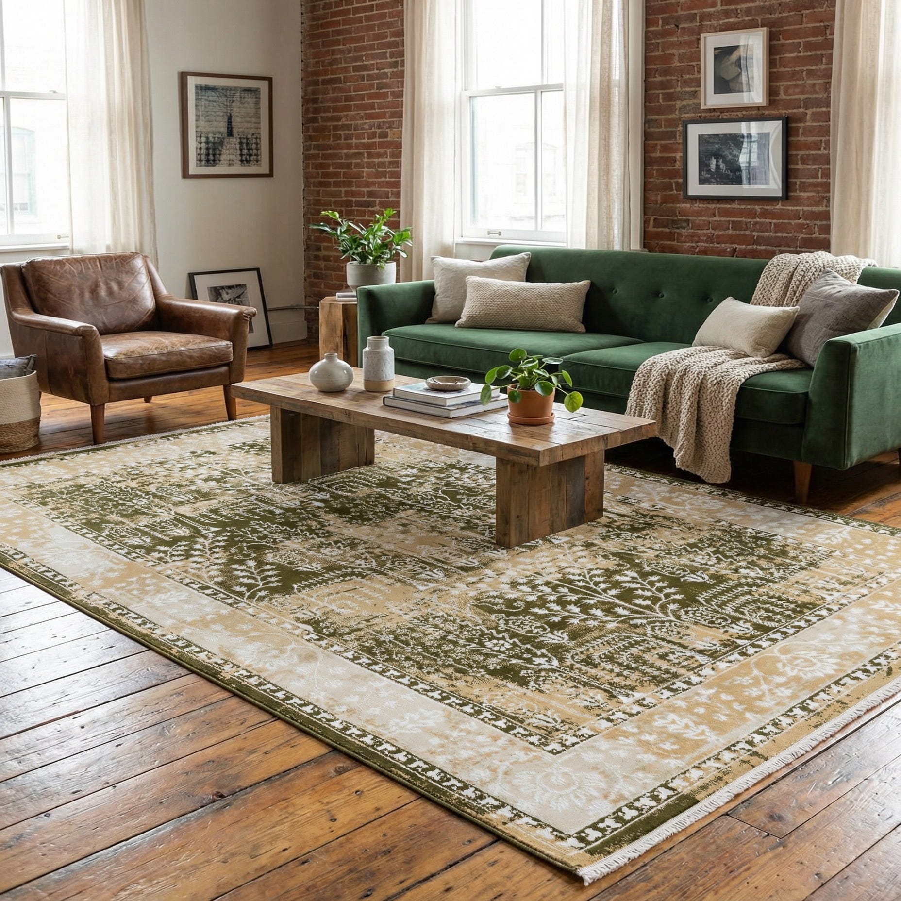 This piece fits easily into a variety of interiors: place it beneath a sofa to anchor a living room conversation area, layer it under a dining table to add pattern without overpowering the setting, or use it in a bedroom to introduce a warm, grounding element. The green and beige palette pairs well with warm wood tones, neutral upholstery, and mixed-metal accents, and suits transitional, modern farmhouse, or traditional schemes where a subtle, timeworn look is desired.