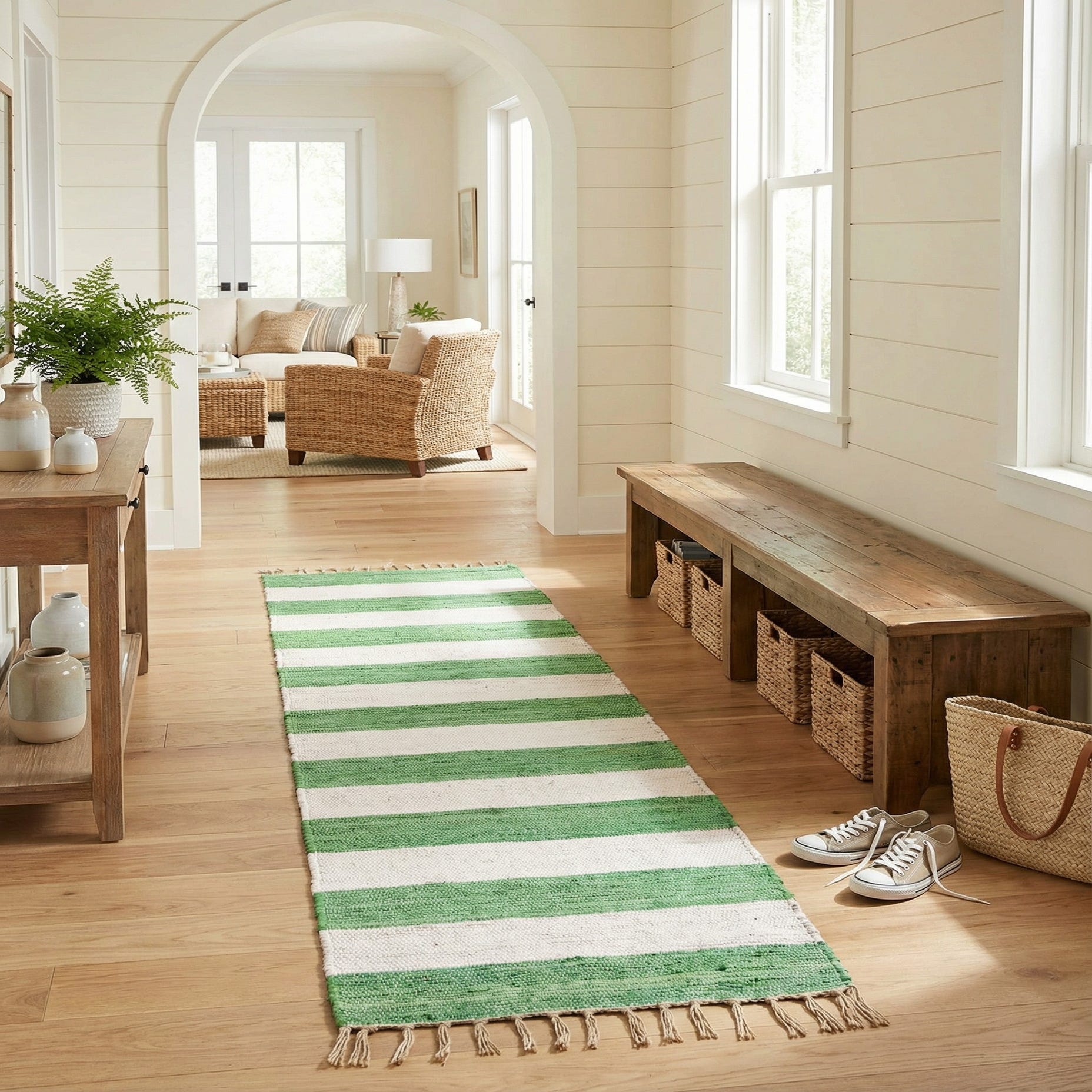 Its long, narrow profile works well in hallways, kitchens, mudrooms, or layered in front of a sofa or bed to add color and texture without raising the pile. Pair it with natural wood floors and woven or rattan accents for a coastal or cottage vibe, use it to bring a pop of color to a minimalist entry, or combine it with painted cabinetry and vintage accents in a casual farmhouse kitchen.