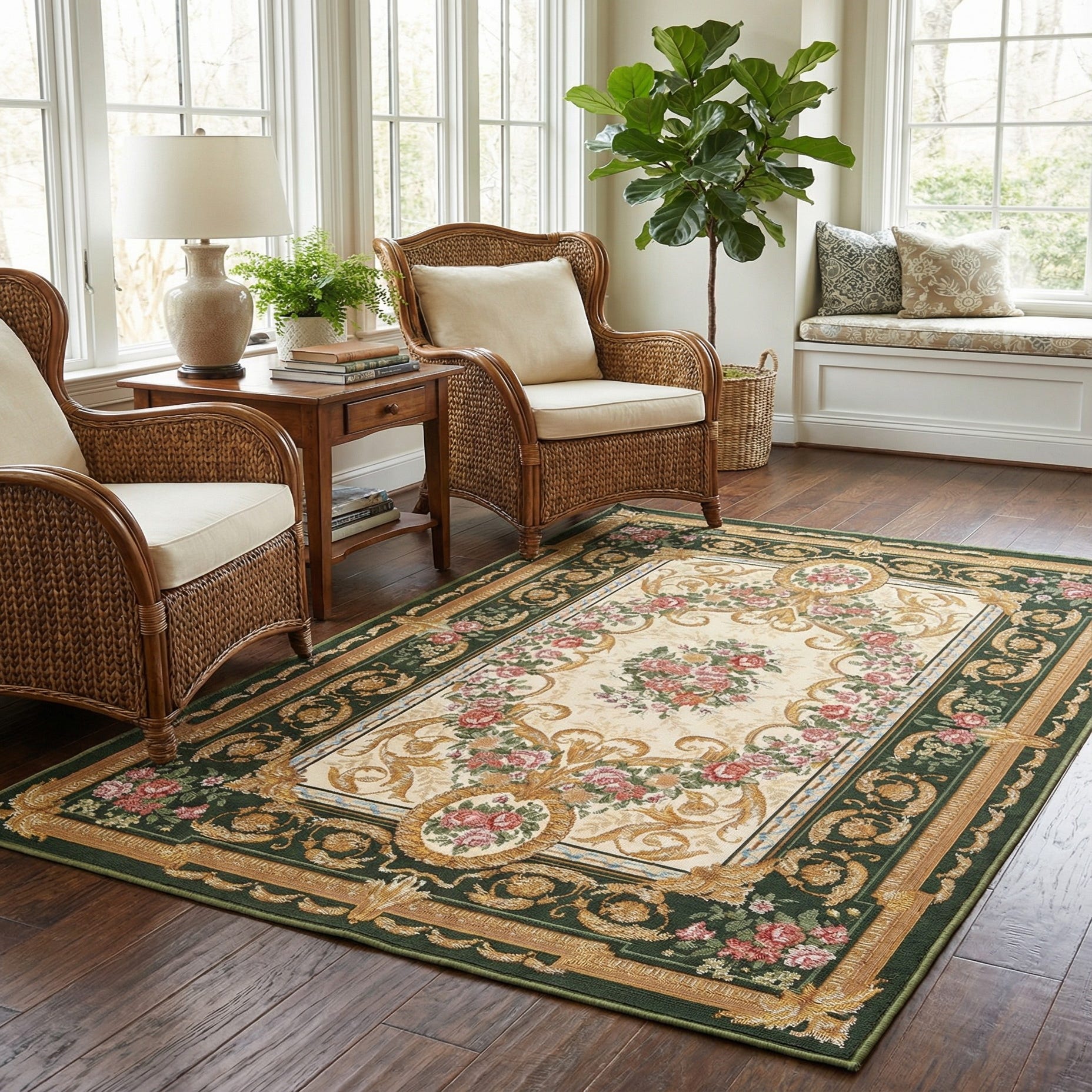Place this piece beneath a round dining table or in a living area to introduce traditional formality without feeling heavy. It pairs nicely with dark wood furniture and brass or gilt accents, or with painted cottage pieces and wicker in a sunroom or covered porch for a more relaxed take on classic style. Use it to anchor an entryway ensemble, layer it over a larger neutral rug, or set it under a bistro table to bring floral warmth to transitional and traditional interiors.