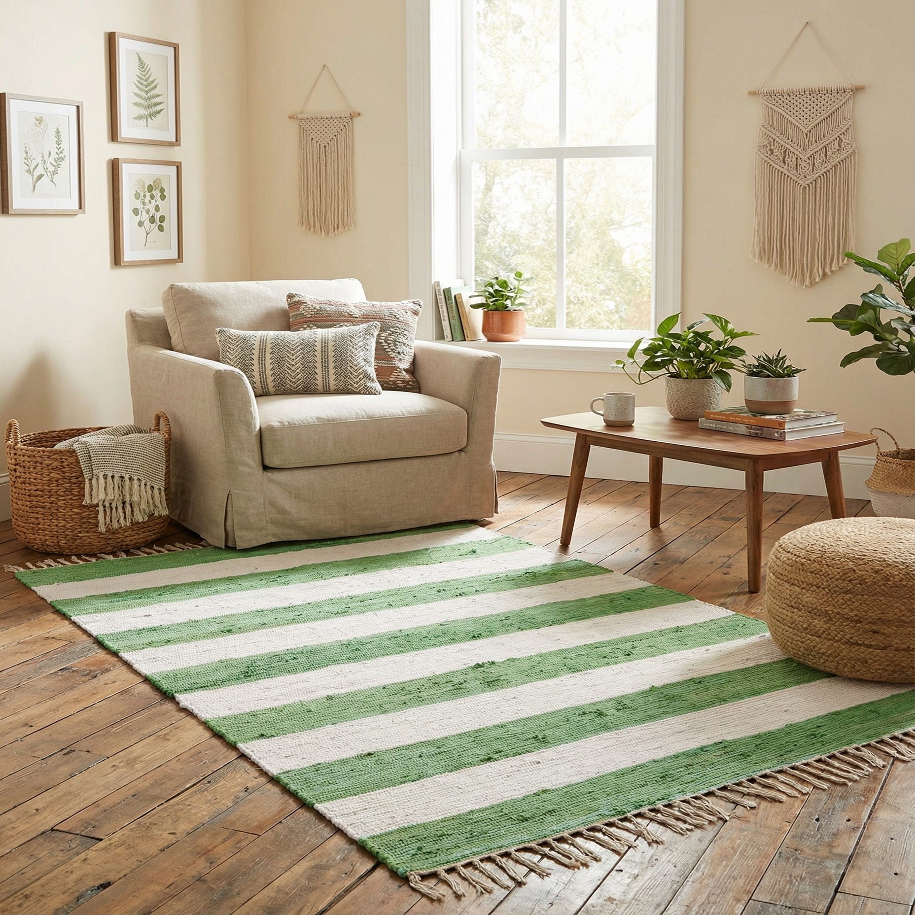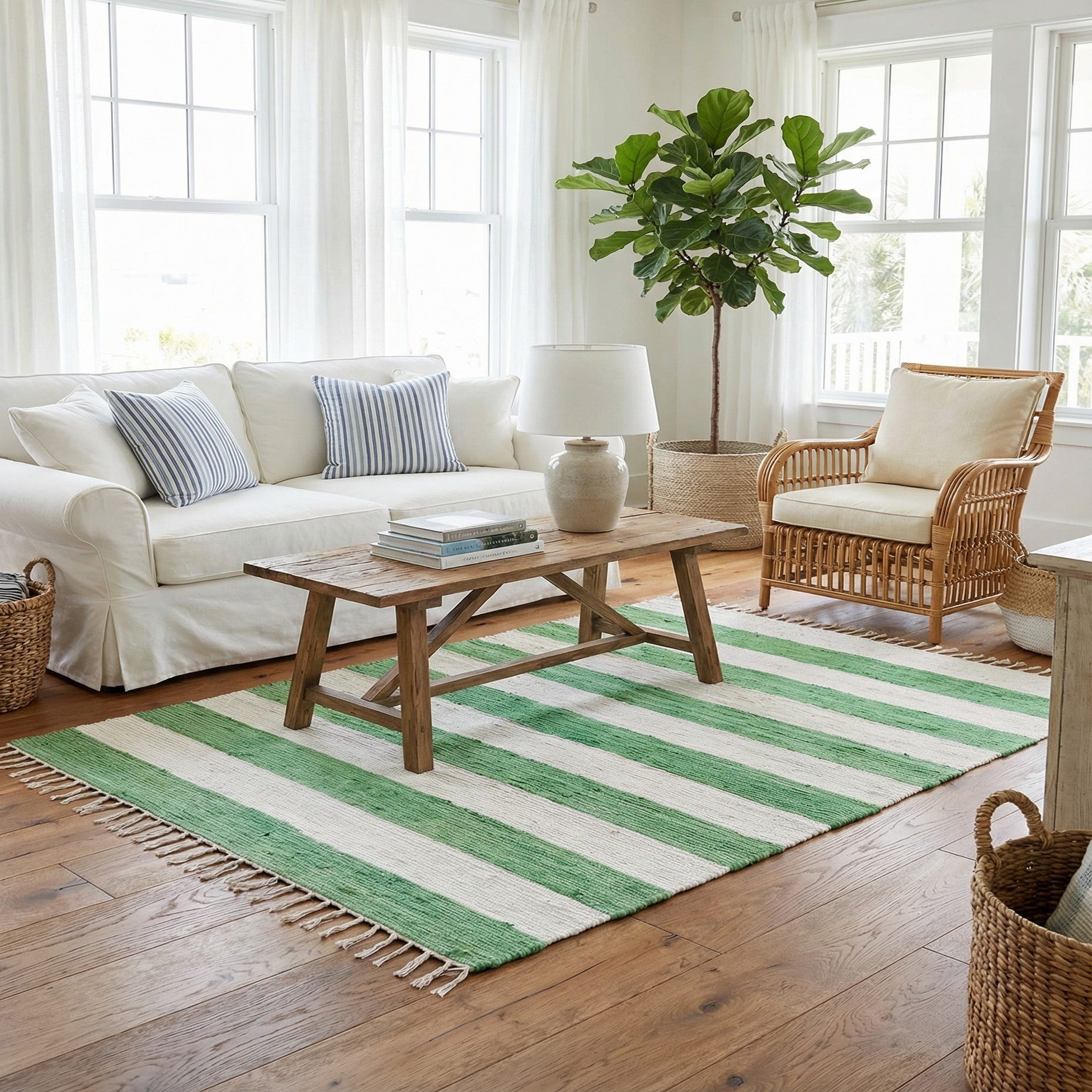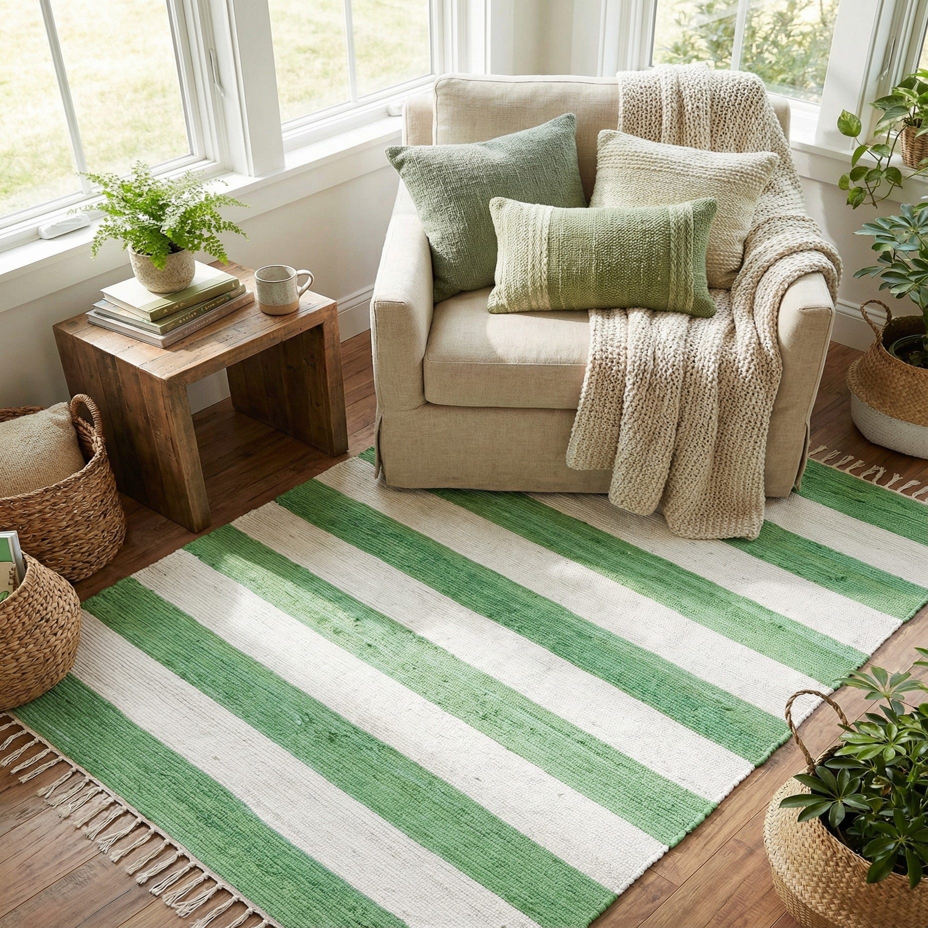 This casual striped piece works well in coastal, cottage, or relaxed modern interiors — think bright entryways, breakfast nooks, sunrooms, or layered beneath a coffee table to add a fresh, grounded touch. The neutral ivory balances the vivid green so it pairs easily with natural woods, white-painted furniture, or woven accents for an inviting, everyday look.