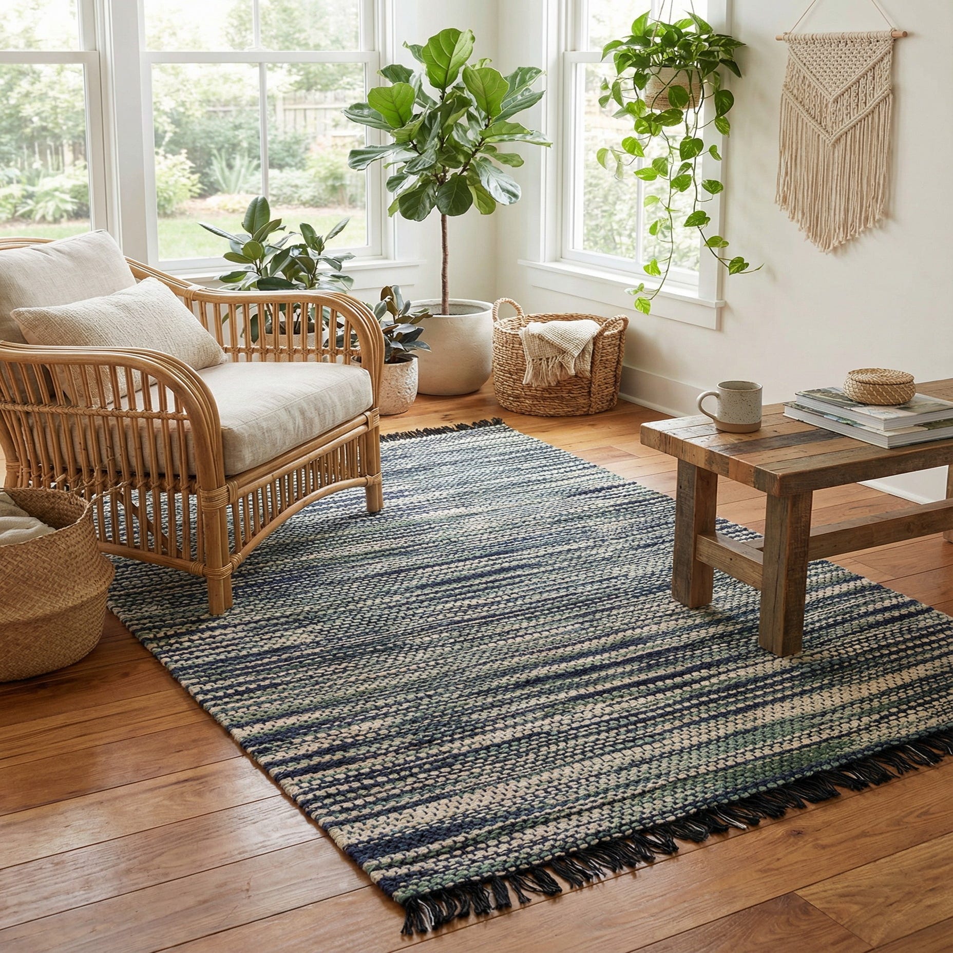 This rug pairs well with casual, coastal, or modern farmhouse interiors and brings organic warmth to contemporary spaces. Place it beneath a coffee table in a living room, layered under a dining table for a grounded, textural base, or set it in an entryway or sunroom to introduce durable, natural fiber styling. It works with neutral palettes as well as rooms that use deep greens and black accents, complementing wooden furniture, woven baskets, and matte metal fixtures.