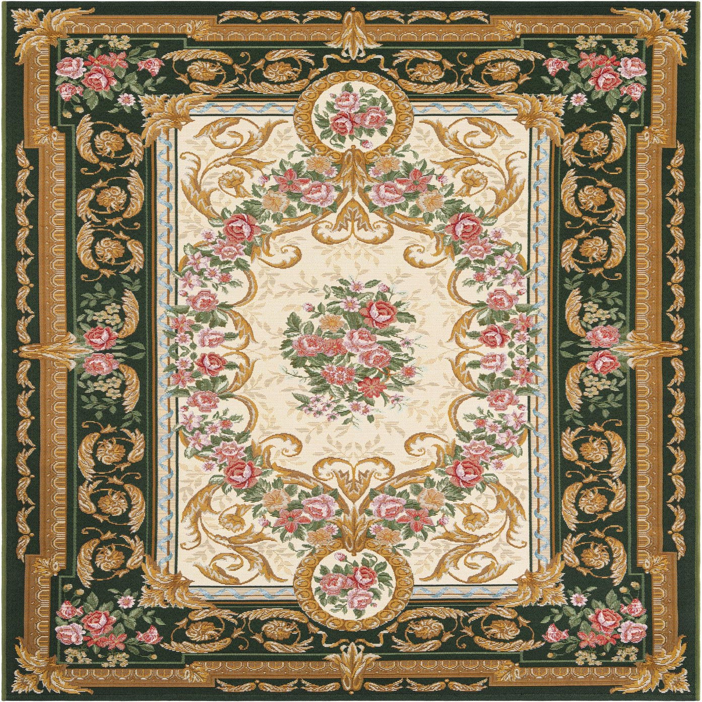 A 5x8 rectangular ivory and green traditional rug with a central floral medallion and ornate border.