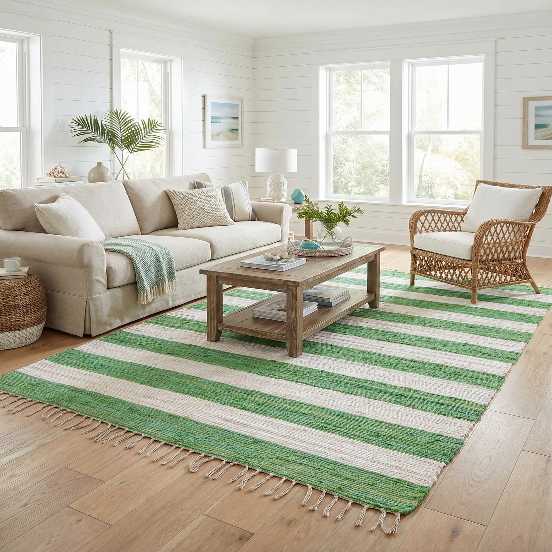 The crisp green and ivory palette works well with coastal, cottage, or modern farmhouse schemes, and pairs nicely with light wood tones and woven textures. Place it in a kitchen, sunroom, or entry to introduce a bit of pattern without overwhelm, or layer it under a coffee table to anchor a casual living area. The soft cotton surface is comfortable underfoot and complements laid-back interiors that favor texture and natural materials.
