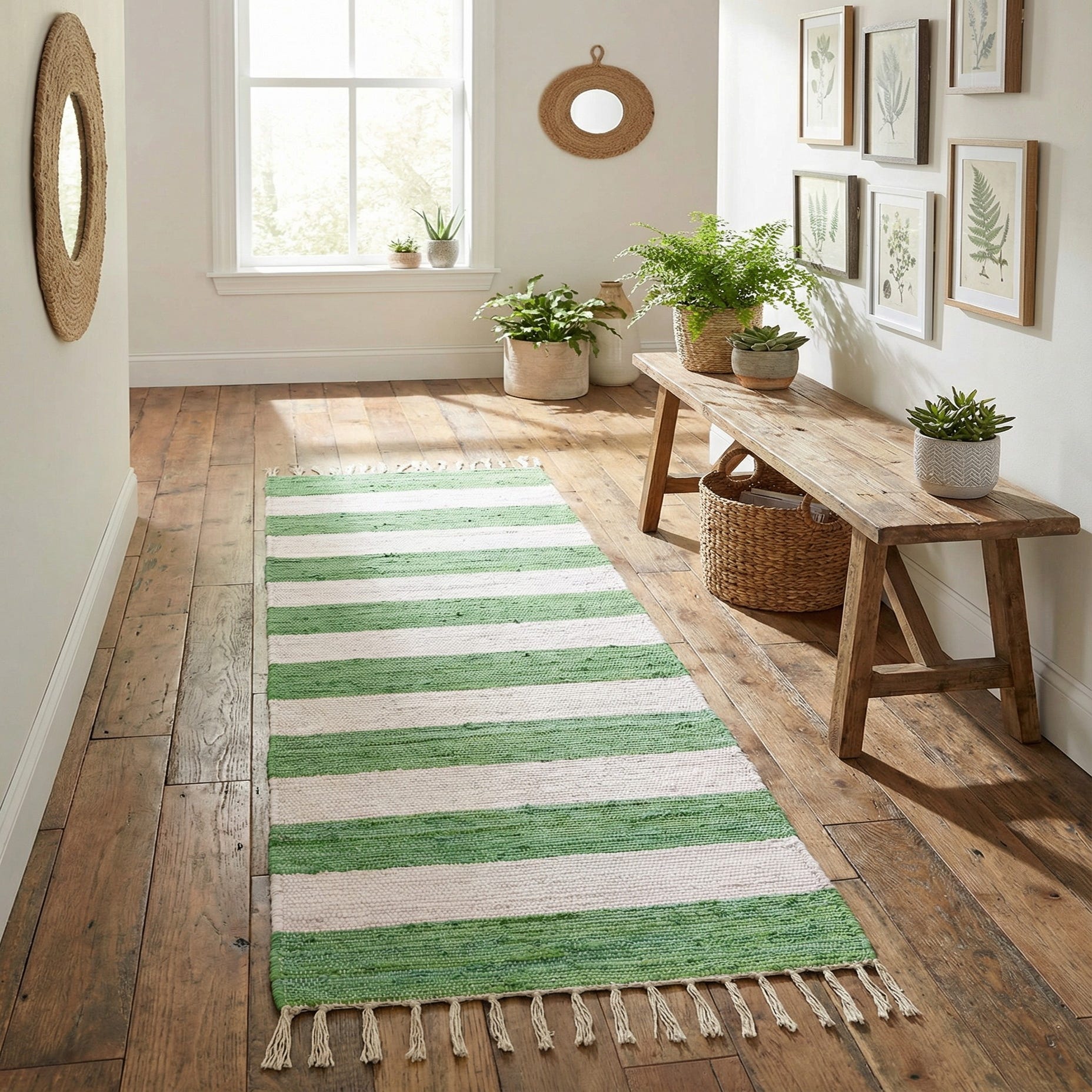 This runner is well-suited to narrow, high-traffic areas—think entryways, hallways, or alongside a kitchen island—where its durable cotton weave and low profile will lay flat and stay unobtrusive. The green-and-ivory palette pairs easily with coastal, cottage, farmhouse, or modern casual interiors and can soften a minimal scheme or add a fresh, grounded layer to more eclectic rooms.