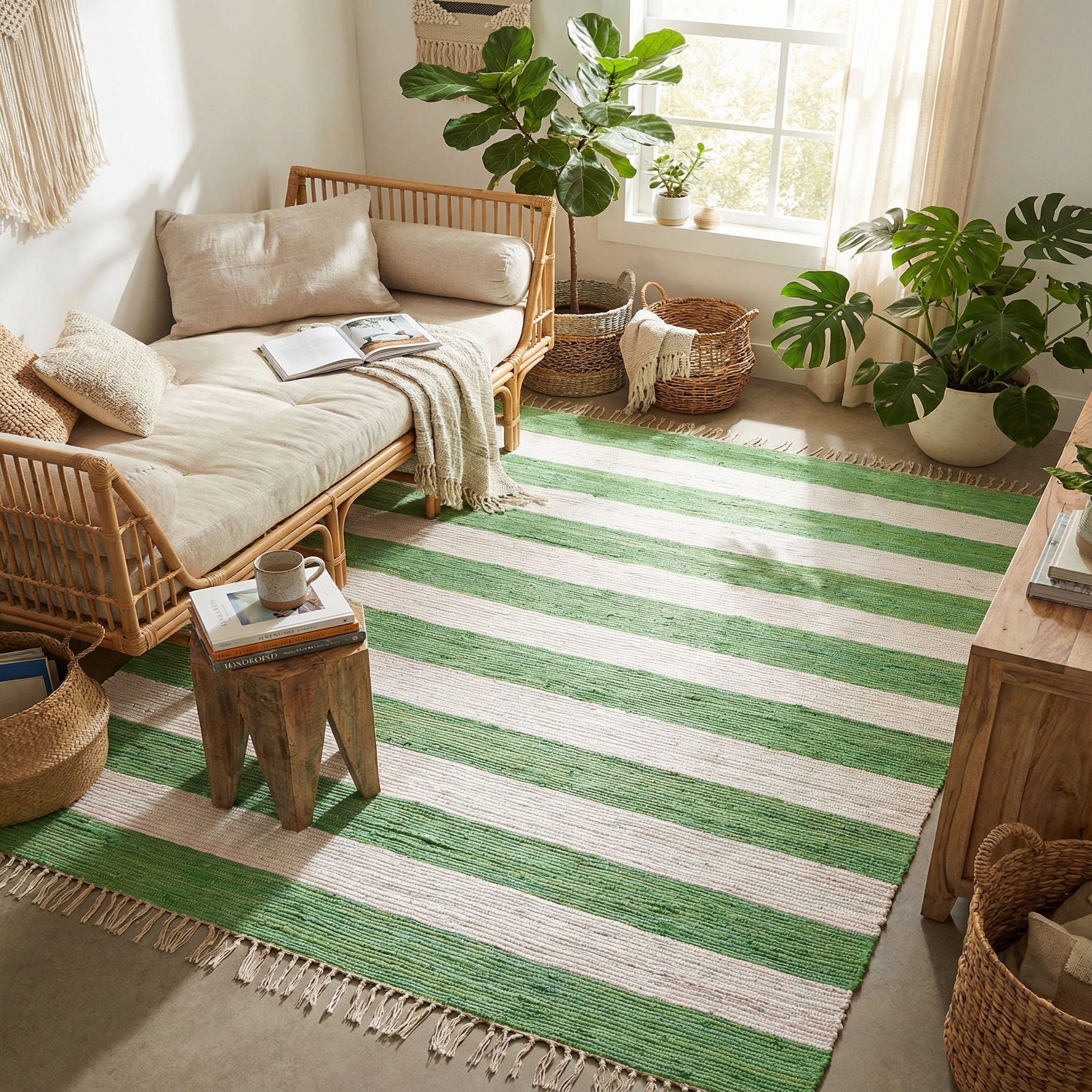 Hand-woven from 100% cotton, this flatweave rug presents a clean, horizontal stripe motif in alternating green and ivory bands. The rag-style construction creates a gently slubby surface with subtle texture and visible weave lines, and the natural fringe on the short ends adds a relaxed, handcrafted finish. Underfoot it feels soft yet grounded, with the cotton weave offering a low-profile, tactile surface that layers easily in a room.