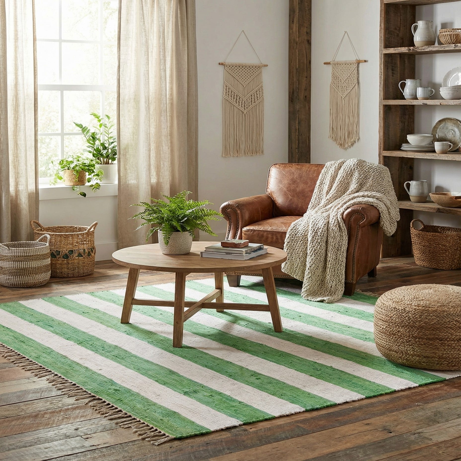 This rug works well in casual, sun-filled interiors — think kitchen, entryway, sunroom or a laid-back living space where natural materials and simple patterns are welcome. Pair it with light wood furniture, woven baskets, and linens for a cottage or coastal look, or layer it beneath a dining table to introduce pattern without overwhelming the room. The green and ivory palette also complements white or neutral walls and offers a fresh contrast against darker woods and leather.
