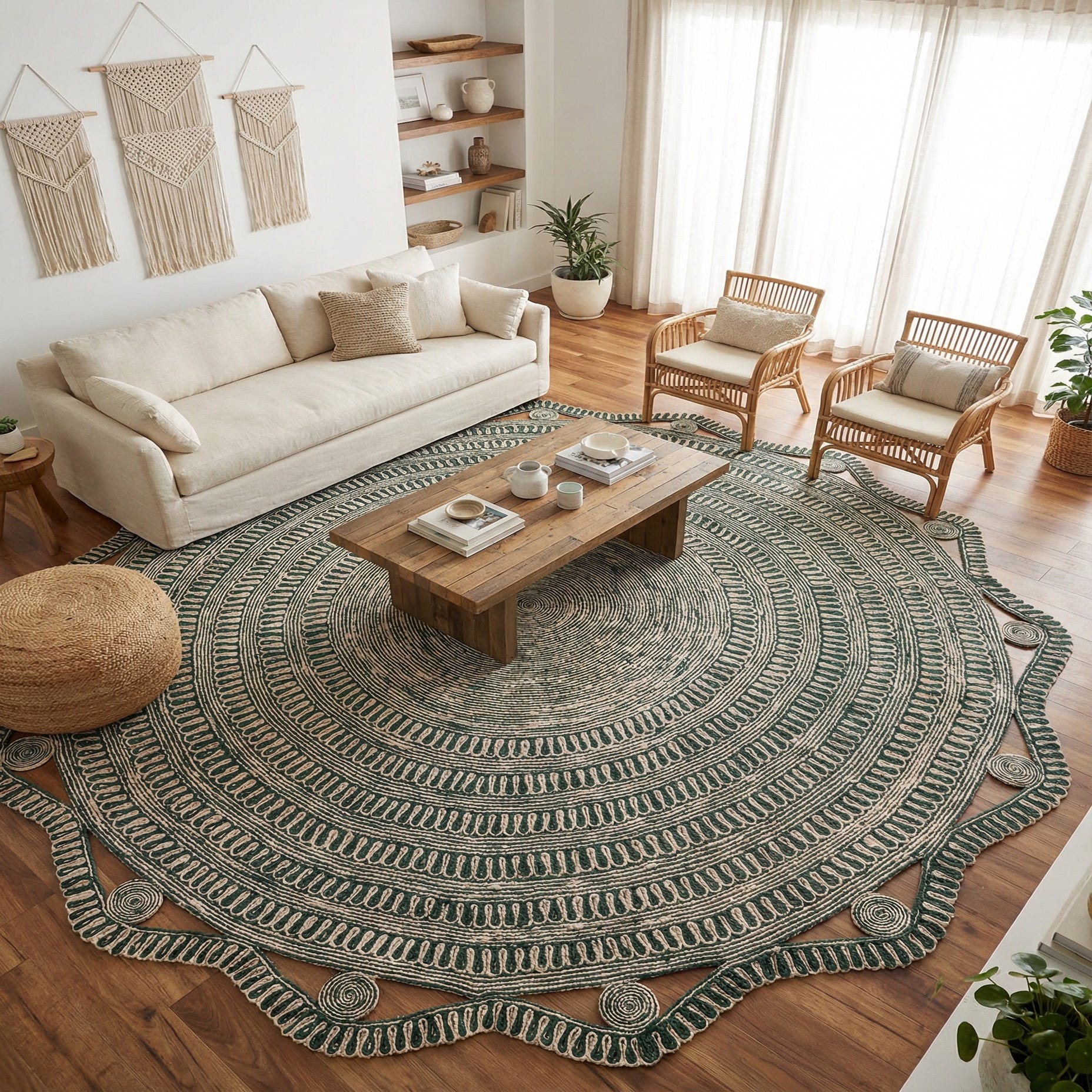 Hand-braided from 100% jute, this round rug shows concentric rings of tight coil weaving punctuated by looped braid accents and a scalloped openwork border with small spiral rosette details. The alternating green and white palette gives the surface clear contrast—deep green braids layered against crisp white coils—while the low, firm pile maintains a tactile, organic feel underfoot. The texture is natural and slightly coarse, with visible hand-crafted braid work that adds directional interest and visual rhythm to the floor.