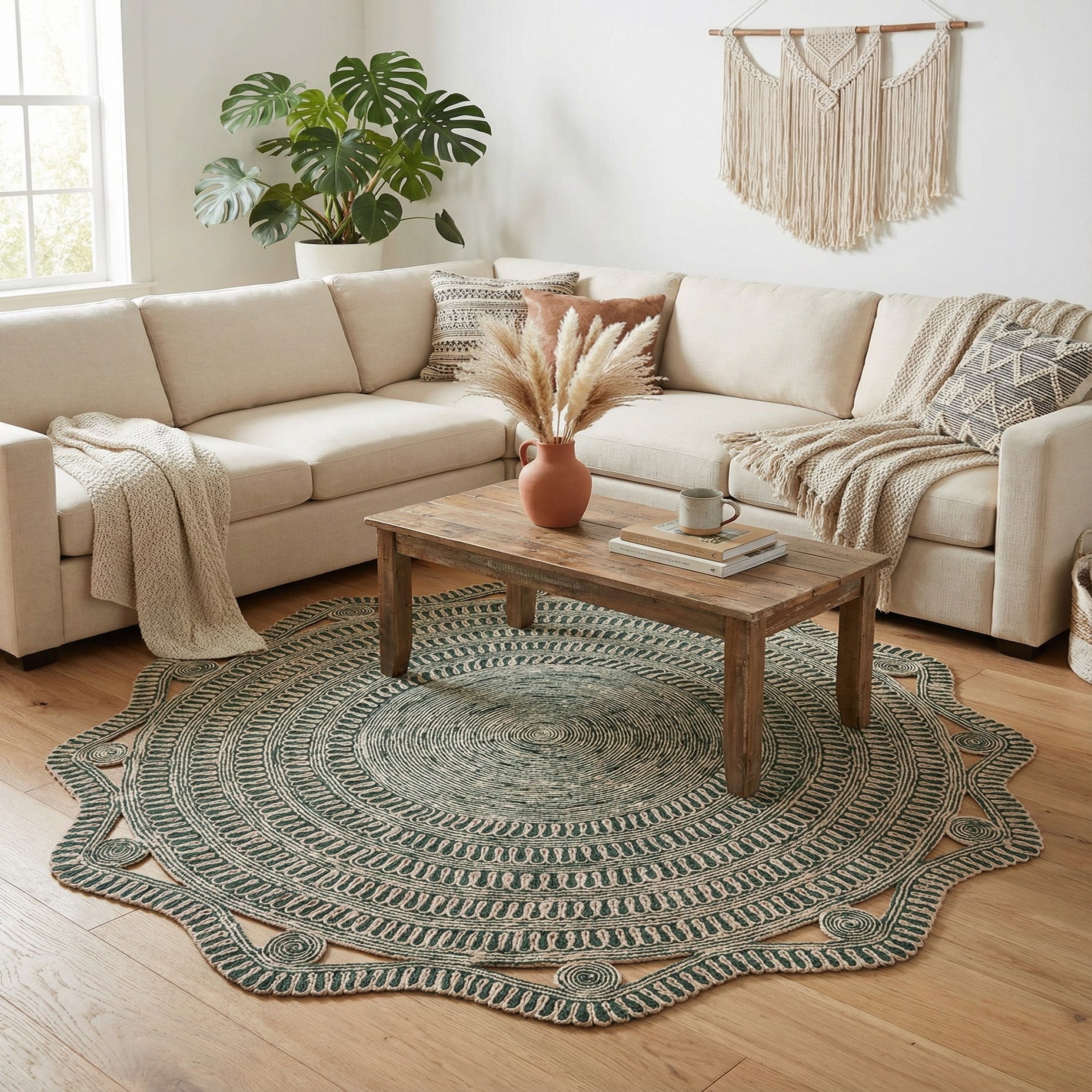 Round green and white braided jute rug with a textured, wavy border and spiral accents, showcasing its natural, modern design.