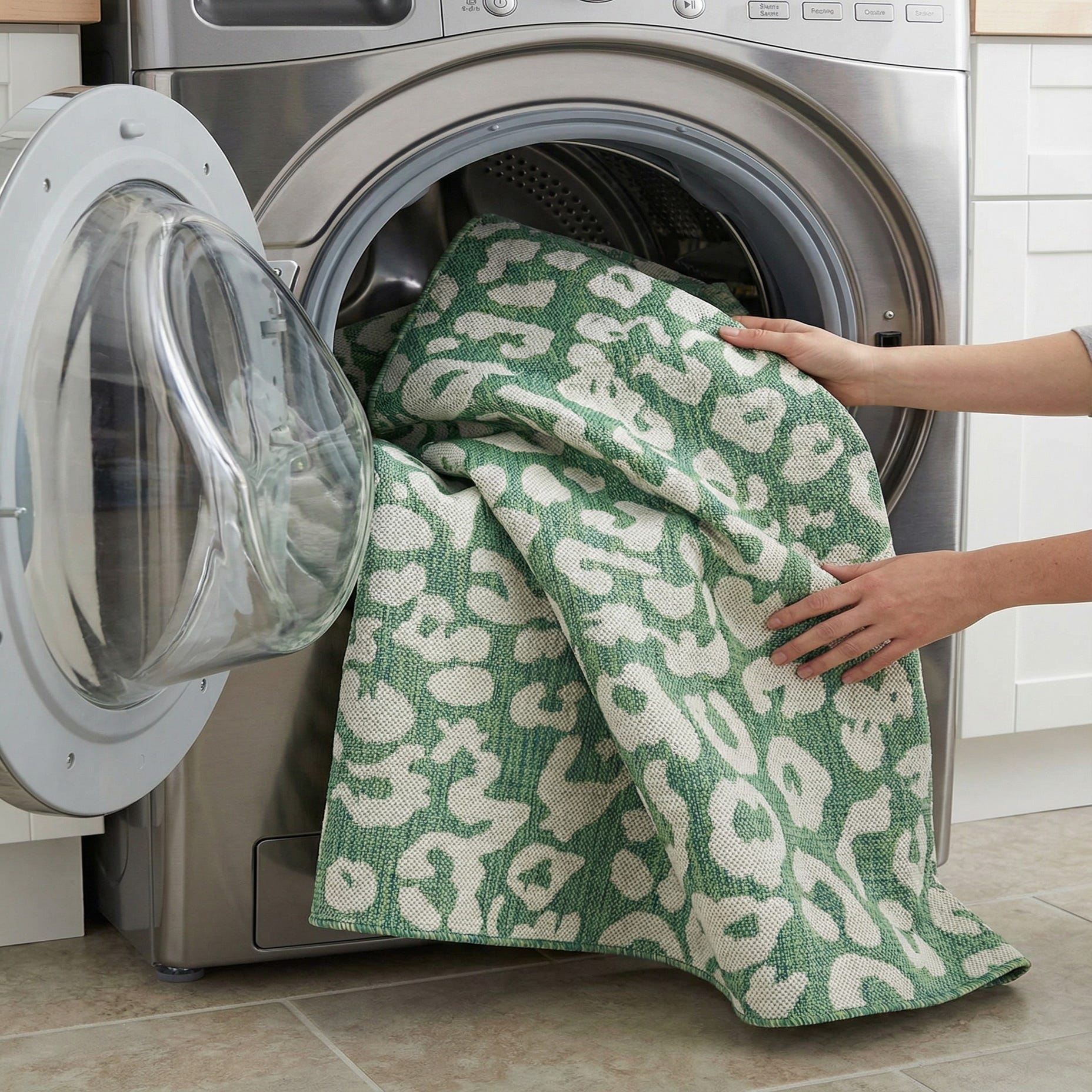 This piece is well-suited for covered patios, sunrooms, or casual living areas where a touch of pattern brightens the space. Pair it with natural rattan or light wood furniture and linen cushions for a relaxed coastal vibe, or use it to add contrast beneath a metal bistro set for a contemporary outdoor corner. It also works layered over a larger neutral rug or anchored under a small dining table to define a cozy seating area.