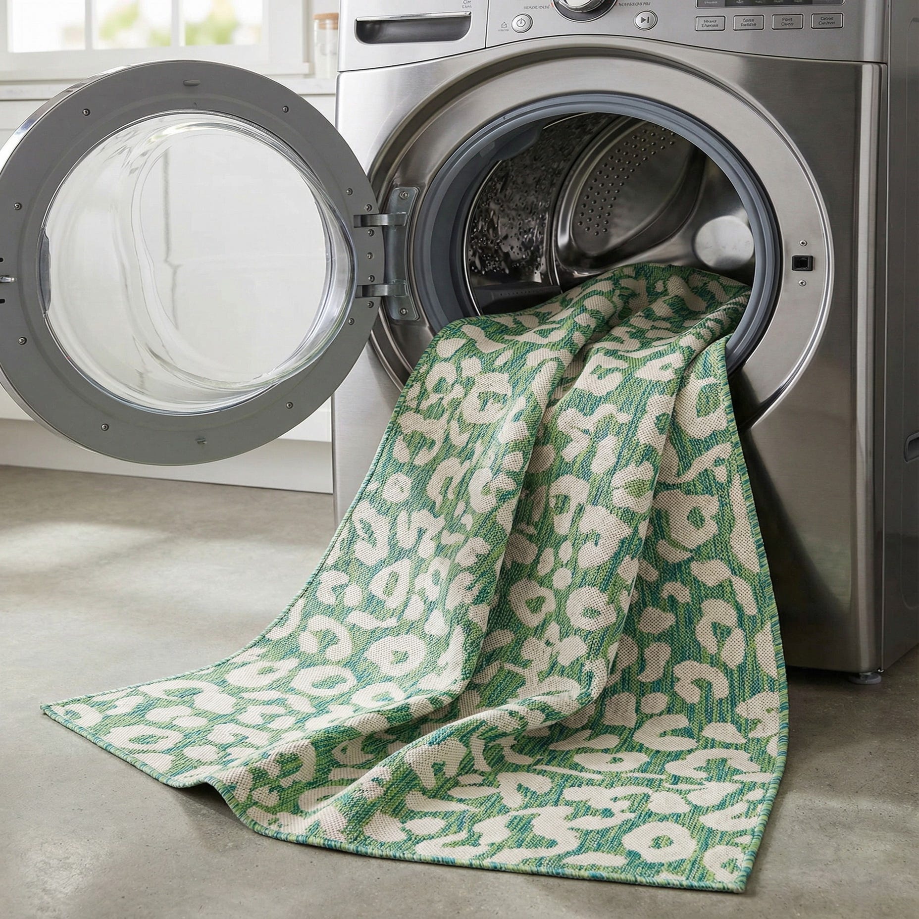 A lively, modern animal print in ivory pops against a Green Blue ground woven with subtle blue and green striations. Irregular, hand-drawn spot shapes create a relaxed leopard motif that feels playful rather than formal, while the linear, multi-tonal background gives the pattern depth and movement. The surface is a low-profile, tightly woven flatweave with a slightly textured hand — smooth underfoot with enough grip to stay in place on hard surfaces. Machine made of 100% polypropylene, the construction delivers consistent color and a uniform weave.