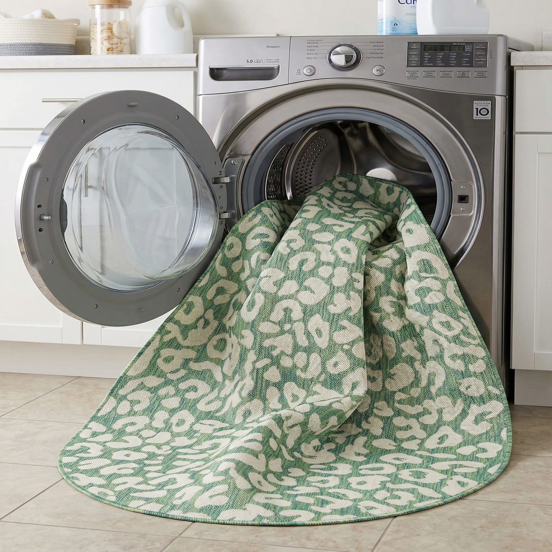 Given its stain-resistant, pet-friendly, and shed-free properties, the rug is especially well-suited for outdoor settings such as patios, decks, and well-covered terraces where it can seamlessly integrate with the natural environment. However, its bold design and robust material also make it an excellent choice for indoor spaces that benefit from an element of whimsy, such as sunrooms, playrooms, or eclectic living areas. The green-blue hues can complement a range of design schemes, including bohemian, tropical, or any decor where a pop of color is desired.