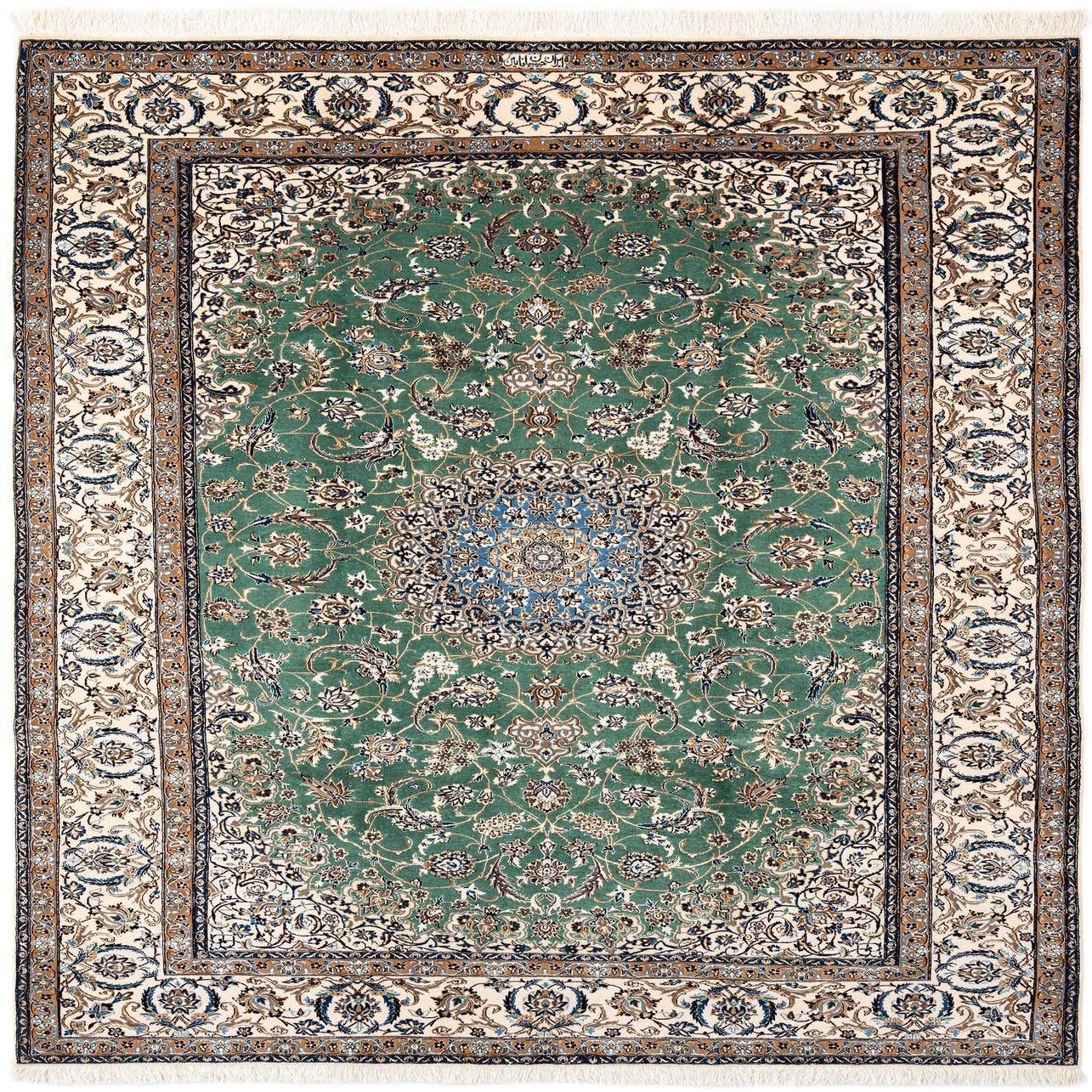 A handmade rectangular Persian rug featuring a lush green field with intricate floral patterns and a detailed cream and brown border.