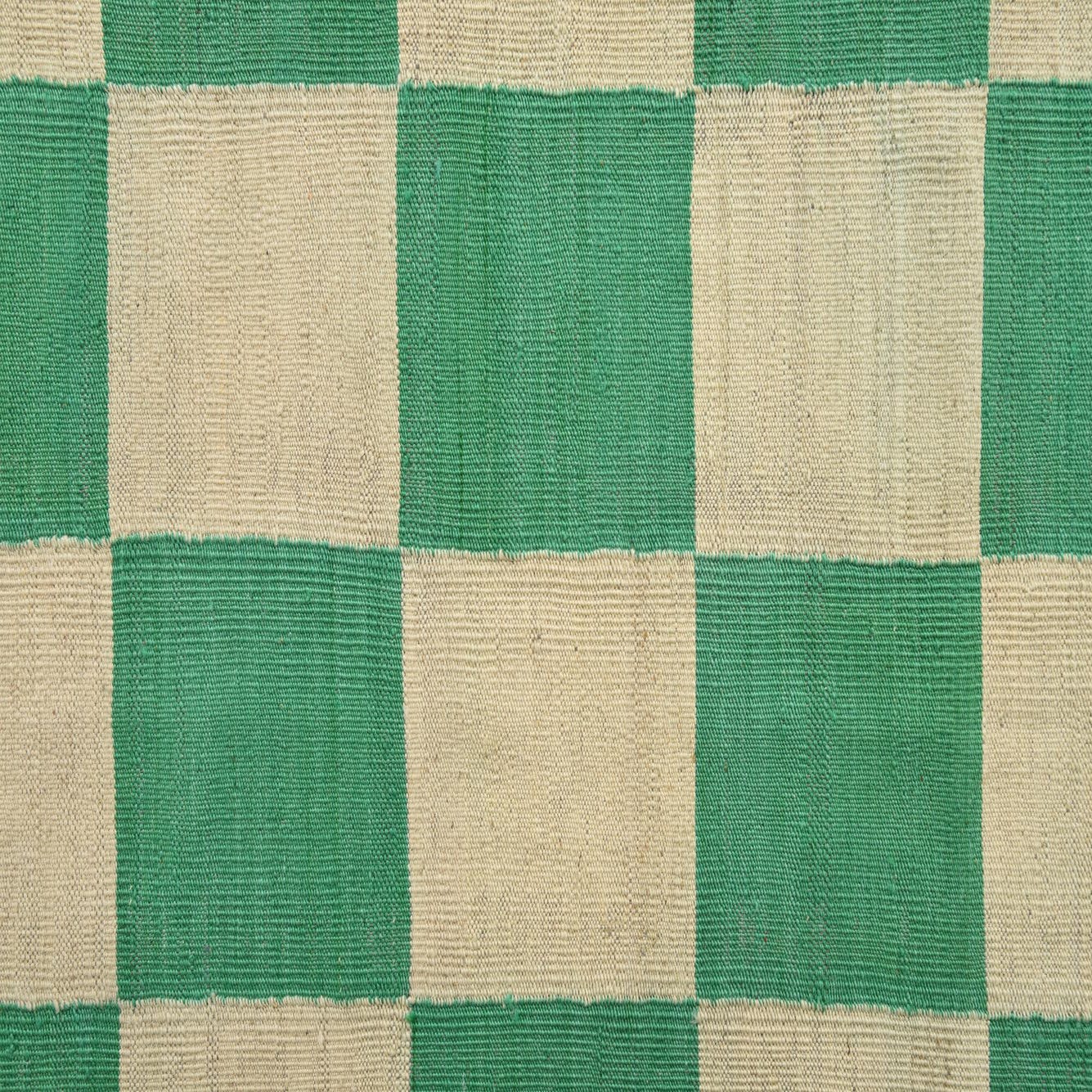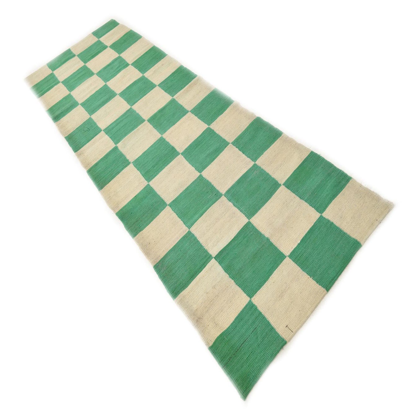 A 10 ft runner rug featuring a bold checkerboard pattern in alternating green and ivory squares, ideal for a hallway.