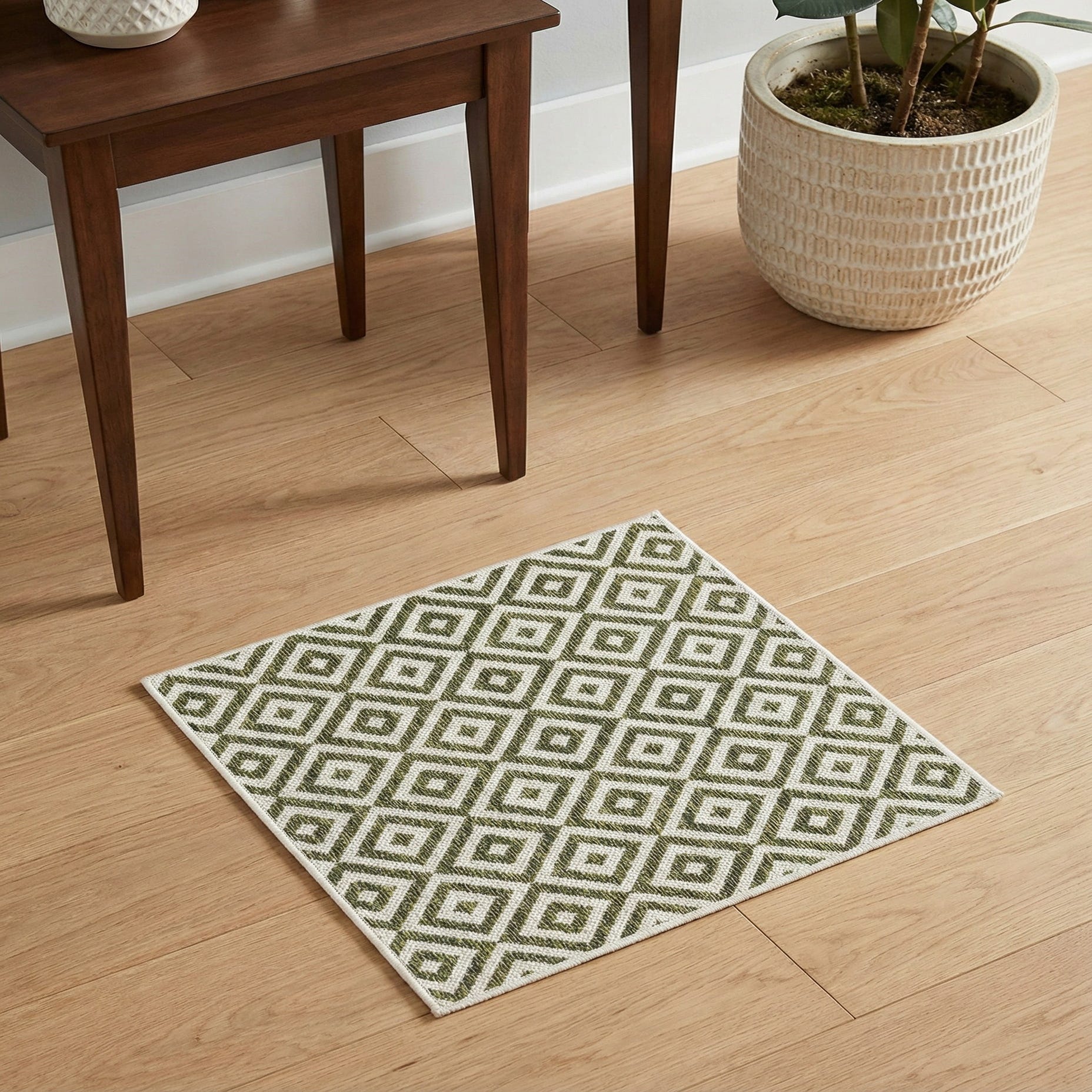 Place this rug on a covered patio or sunroom to add pattern without overwhelming the space; it pairs naturally with woven rattan, light wood furniture and lots of plants. Indoors, it anchors casual dining areas, kitchens or entryways, and works well layered over hardwood or concrete. The green-and-ivory palette complements coastal, modern farmhouse and transitional schemes, and coordinates with linen textiles, natural fibers and warm metallic accents for a relaxed, put-together look.