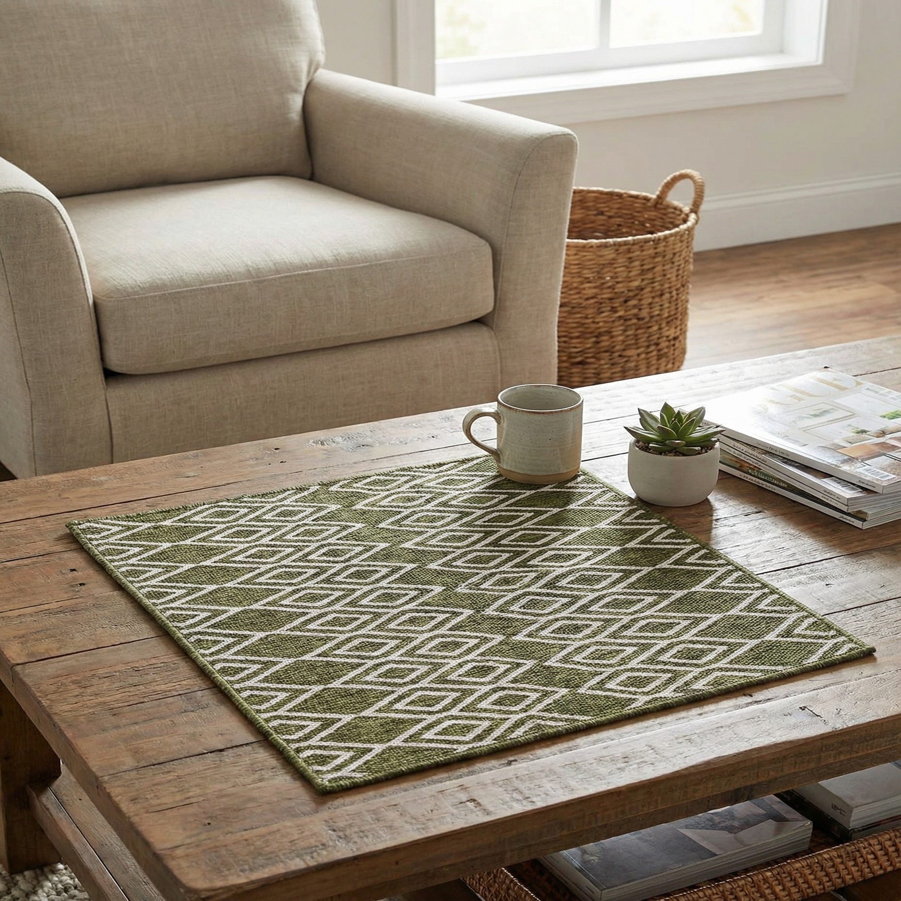Machine-made from 100% polypropylene, this sample was made for indoor-outdoor living and performs well where you want style without a heavy pile. Place it on a covered patio or sunroom to anchor a conversation area, use it in an entry or mudroom for a graphic pop against natural wood, or layer it under a modern dining table paired with rattan or white-painted chairs. Its green-and-ivory palette pairs nicely with warm woods, woven textures, and crisp neutrals for a fresh, contemporary look.