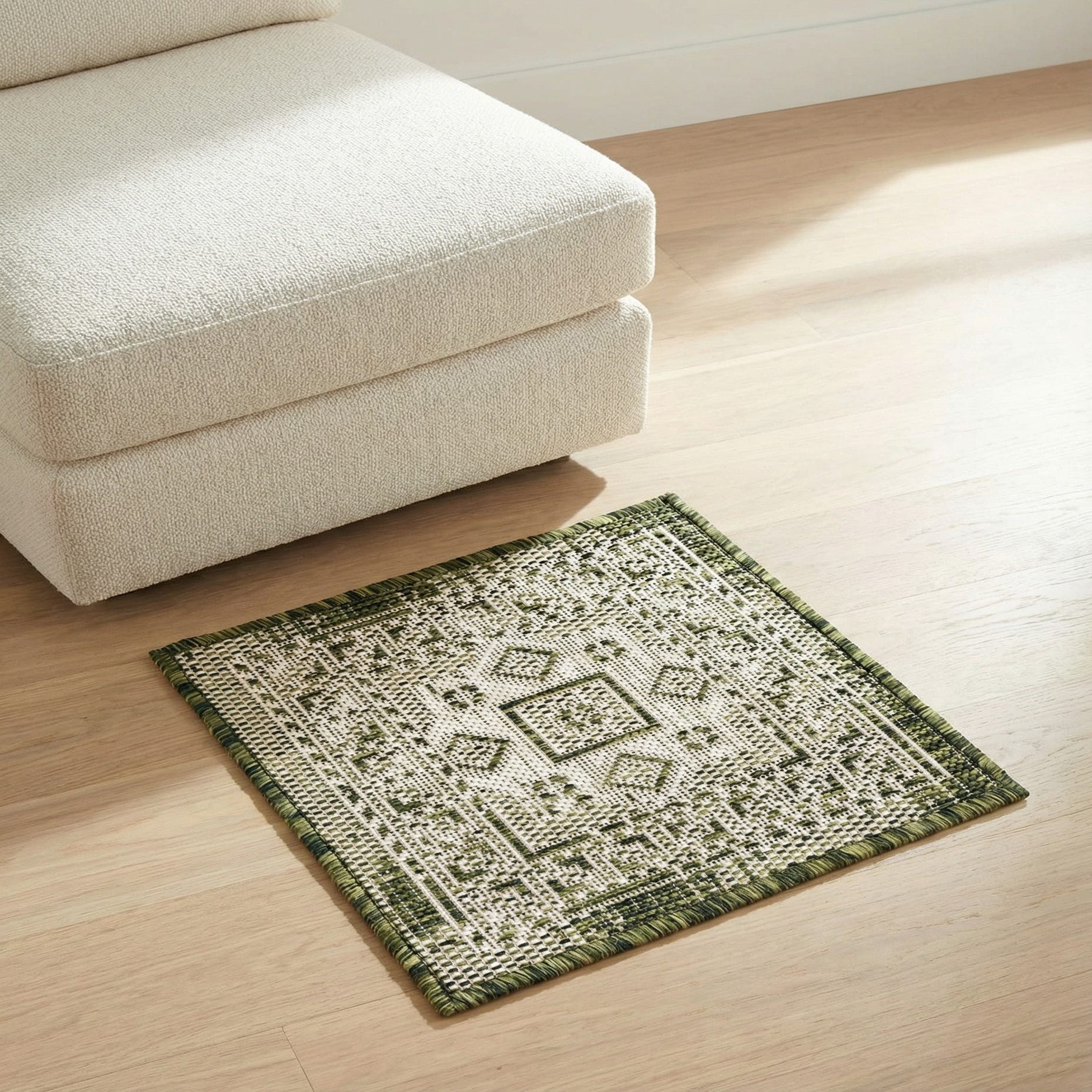 The Outdoor Aztec Collection rug is a versatile and durable piece, machine woven from 100% polypropylene, designed to complement an array of outdoor and high-traffic indoor spaces. This rug showcases a dynamic pattern that artfully blends geometrics and traditional motifs, creating an appealing Aztec-inspired design. The primary green background is tastefully contrasted with ivory accents, offering visual interest without overwhelming the aesthetic.