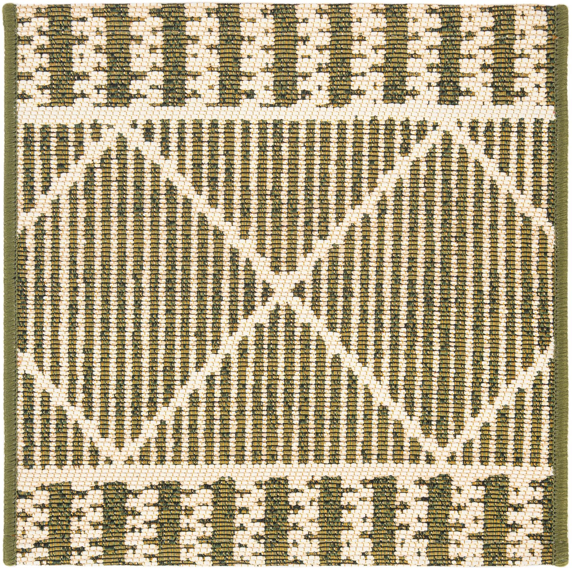 A crisp geometric layout gives this rug a fresh, modern character: an ivory lattice of intersecting diagonal lines overlays a field of narrow vertical ribbing, with banded border details at the top and bottom. The background color is green, with ivory accents that create clear contrast and a structured, garden-inspired motif. Machine-made from 100% polypropylene, the weave sits low and firm with a flatweave feel; the ivory pattern has a slight raised texture against the tighter green ribs, offering visual depth without a high pile. This piece is a sample.