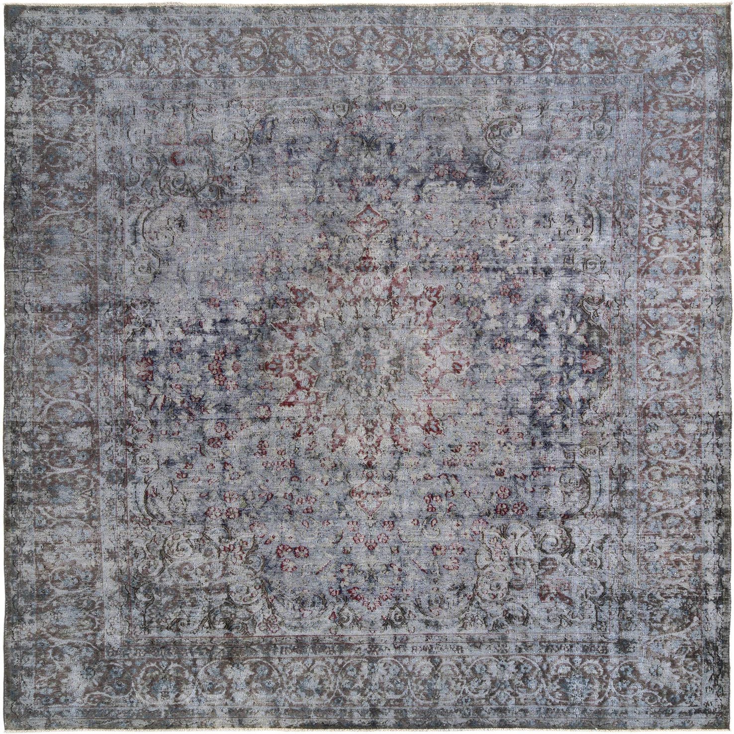 A 10x13 rectangular grey Persian wool rug with a distressed traditional pattern and subtle red accents.
