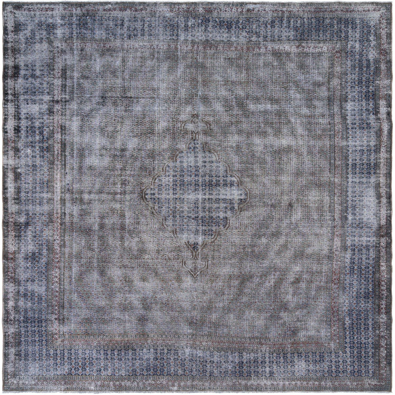 A 10x13 rectangular grey Persian wool rug with a faded central medallion and intricate border design.