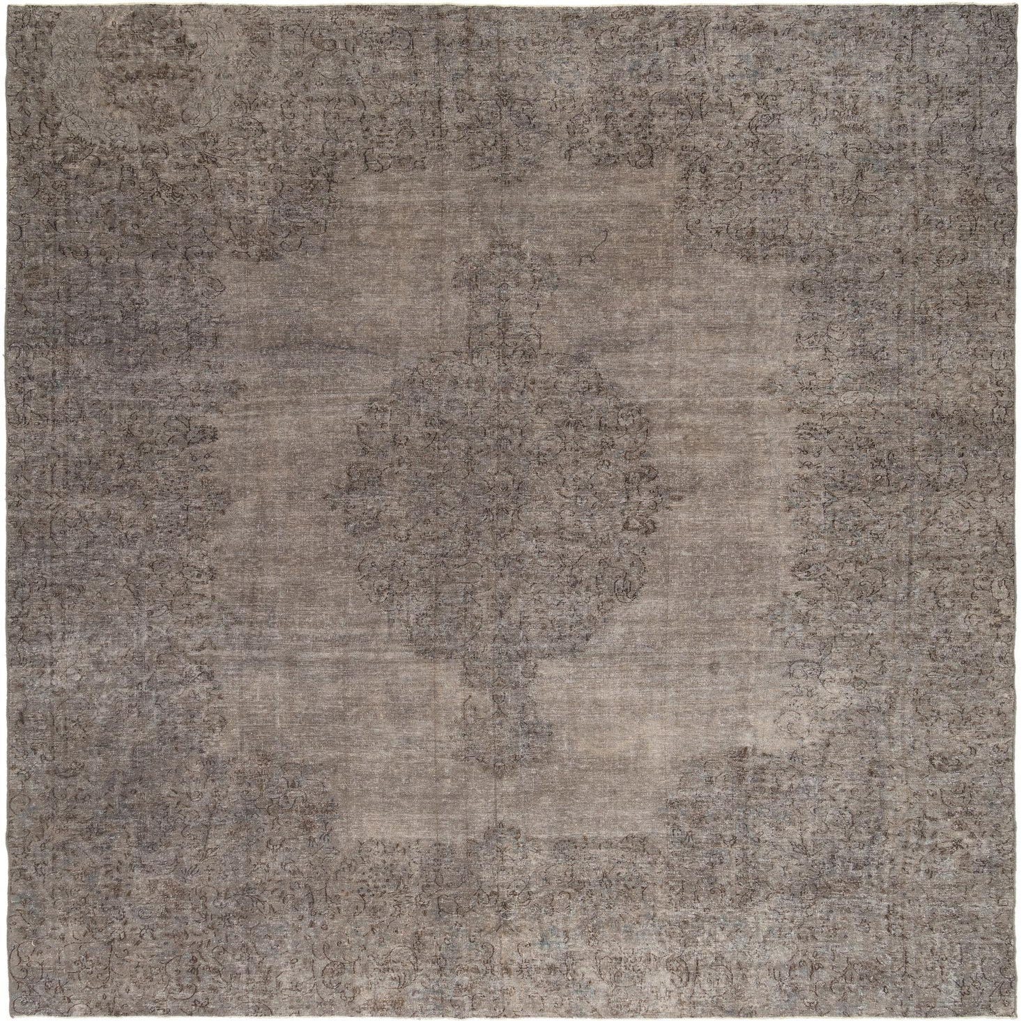 A 10x13 rectangular grey Persian wool rug with a faded, intricate traditional pattern, suitable for a living room.