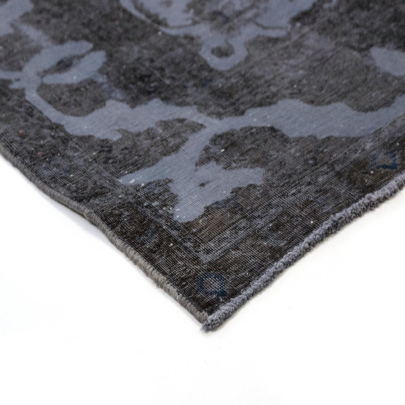 A vintage-inspired field of charcoal grey provides the backdrop for a muted light-blue medallion and scrolling border. The pattern is a traditional medallion-and-border layout with delicately distressed floral and ornamental motifs, giving the design an aged, layered appearance. Hand-knotted from 100% wool, the rug has a low, dense pile with a soft, tactile hand and a subtle, lived-in luster that highlights the contrast between the grey ground and the light-blue pattern.