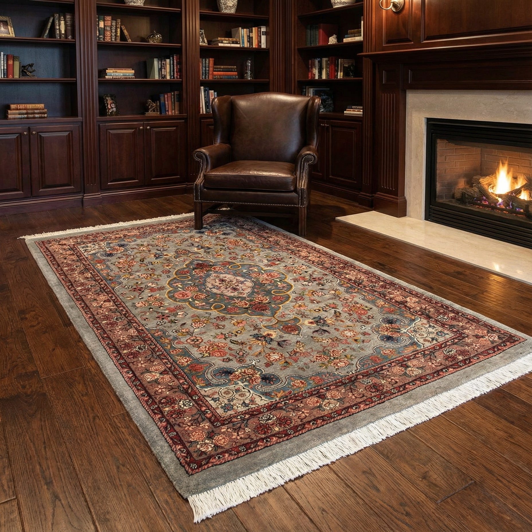 Detailed with traditional floral and geometric motifs, this rug embodies a timeless aesthetic that would be well-suited for formal living rooms, dining areas, or any space where a touch of sophistication is desired. The balanced mix of warm and cool tones in the design allows this rug to integrate seamlessly into both contemporary and classic interiors.