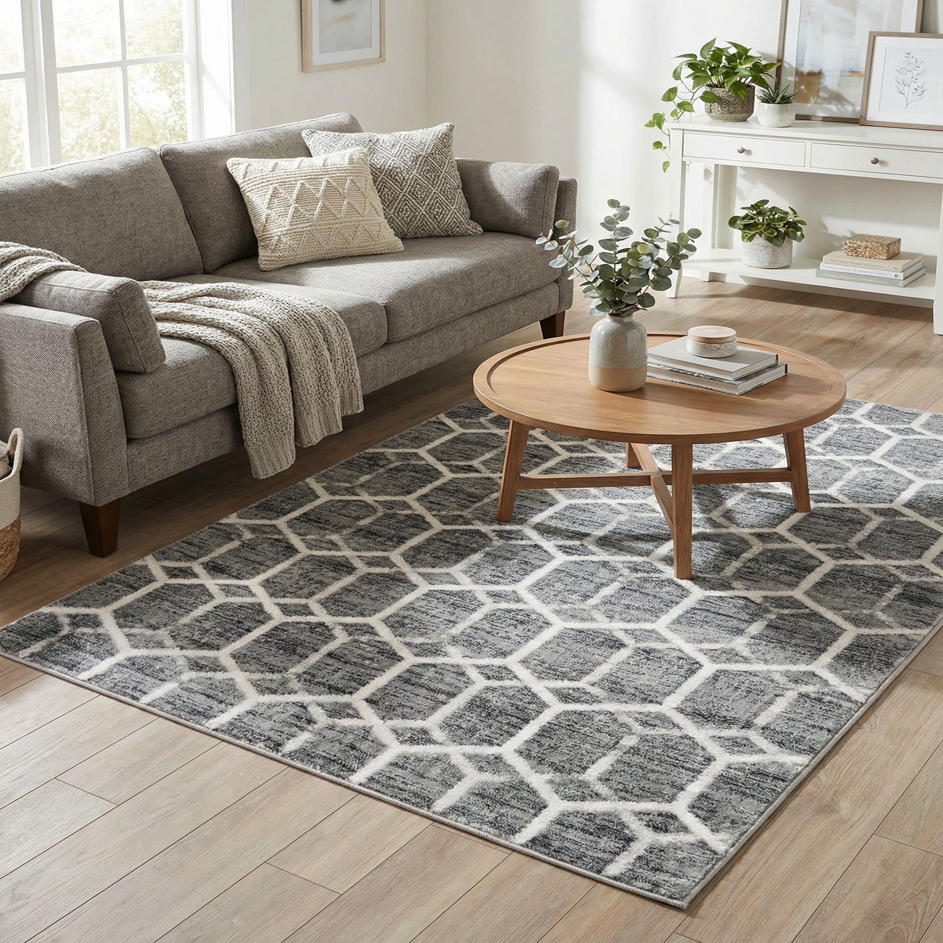 A 4x6 rectangular grey area rug featuring a white geometric trellis pattern, ideal for a living room.