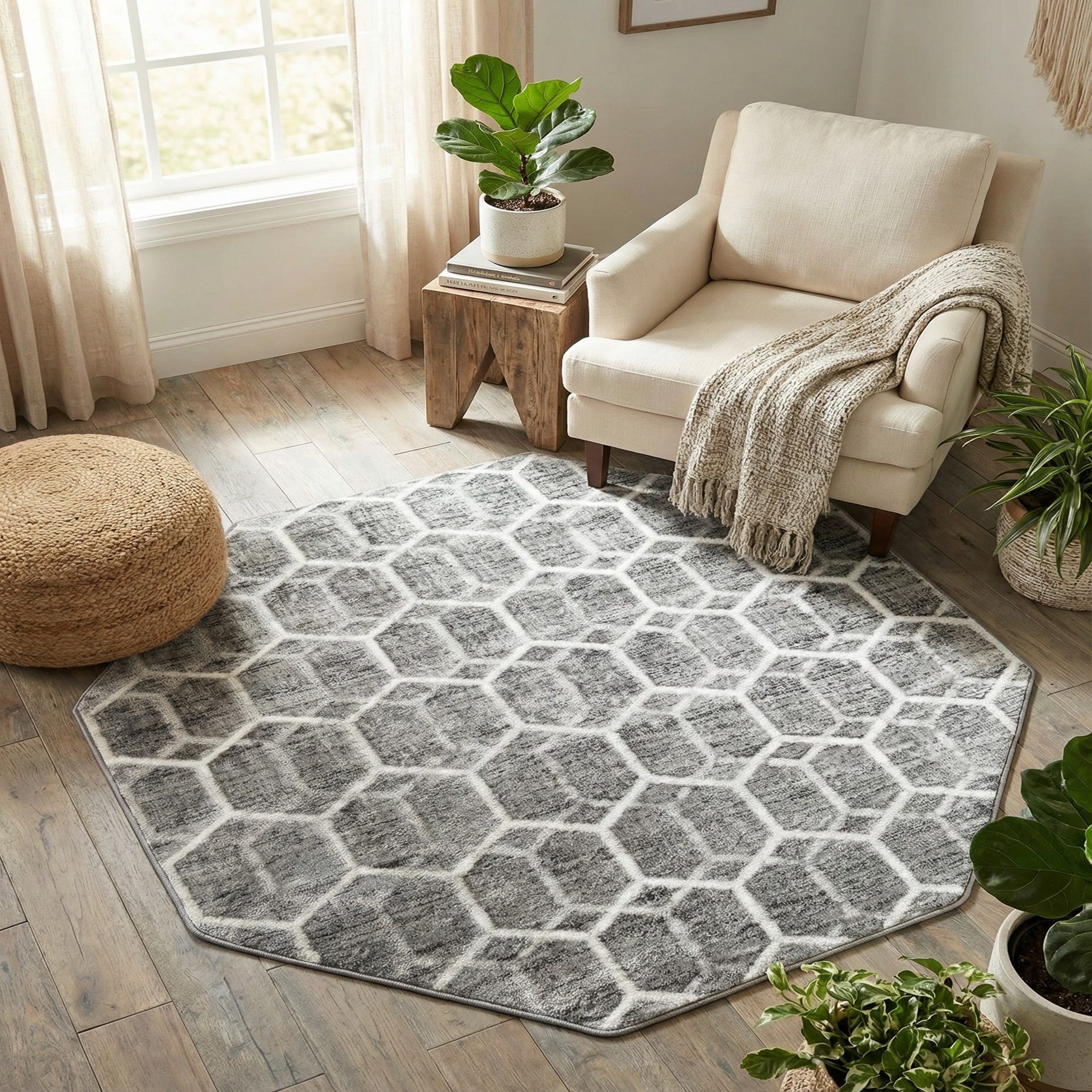 This Lattice Trellis Collection rug features a modern geometric pattern composed of contrasting grey and ivory hues. Its octagonal shape measures 5 feet across, providing a unique footprint for any room. The design showcases a series of interlocking diamond shapes, giving the piece a sense of rhythm and dimension. Machine-woven with 100% polyester, the rug offers a soft texture that is both stain-resistant and shed-free, ensuring durability and easy maintenance.