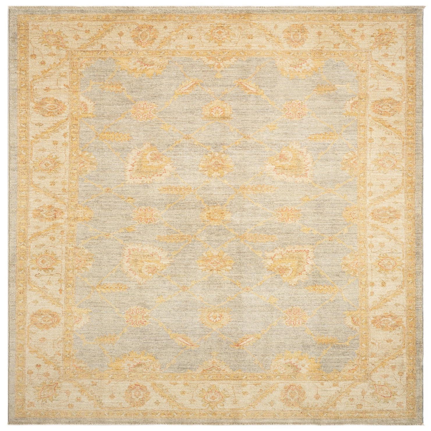 A 5x8 rectangular grey Persian wool rug with an intricate gold and subtle red floral border and central medallion pattern.