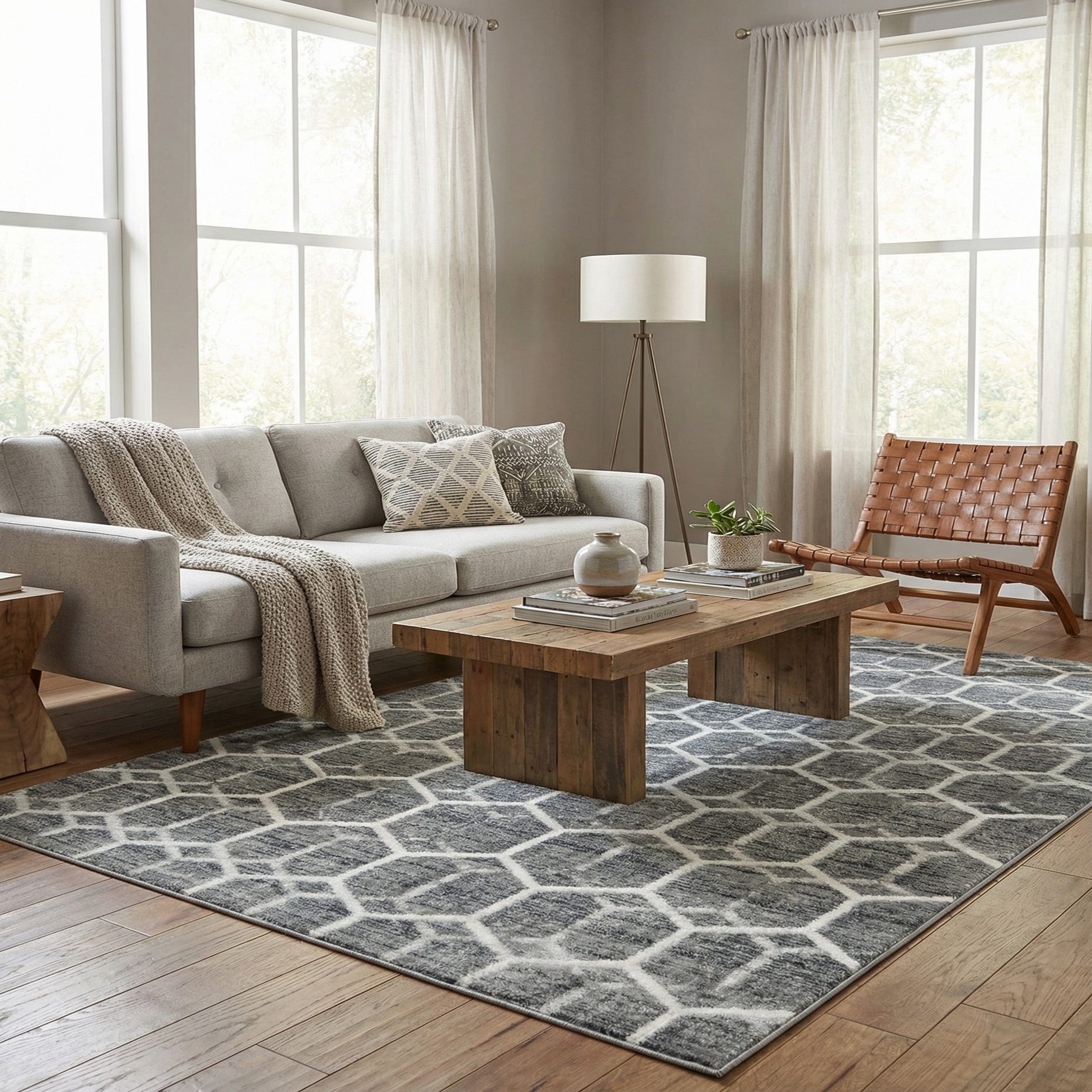 A soft grey field with subtle tonal variation provides a neutral backdrop for a crisp ivory lattice of interlocking hexagons. The geometric trellis is slightly raised from the ground, so you can feel the defined pattern underfoot as a gentle contour against the smoother grey surface. The polyester fibers have a velvety touch and a faint sheen that catches light without overpowering the overall calm palette of grey and ivory.