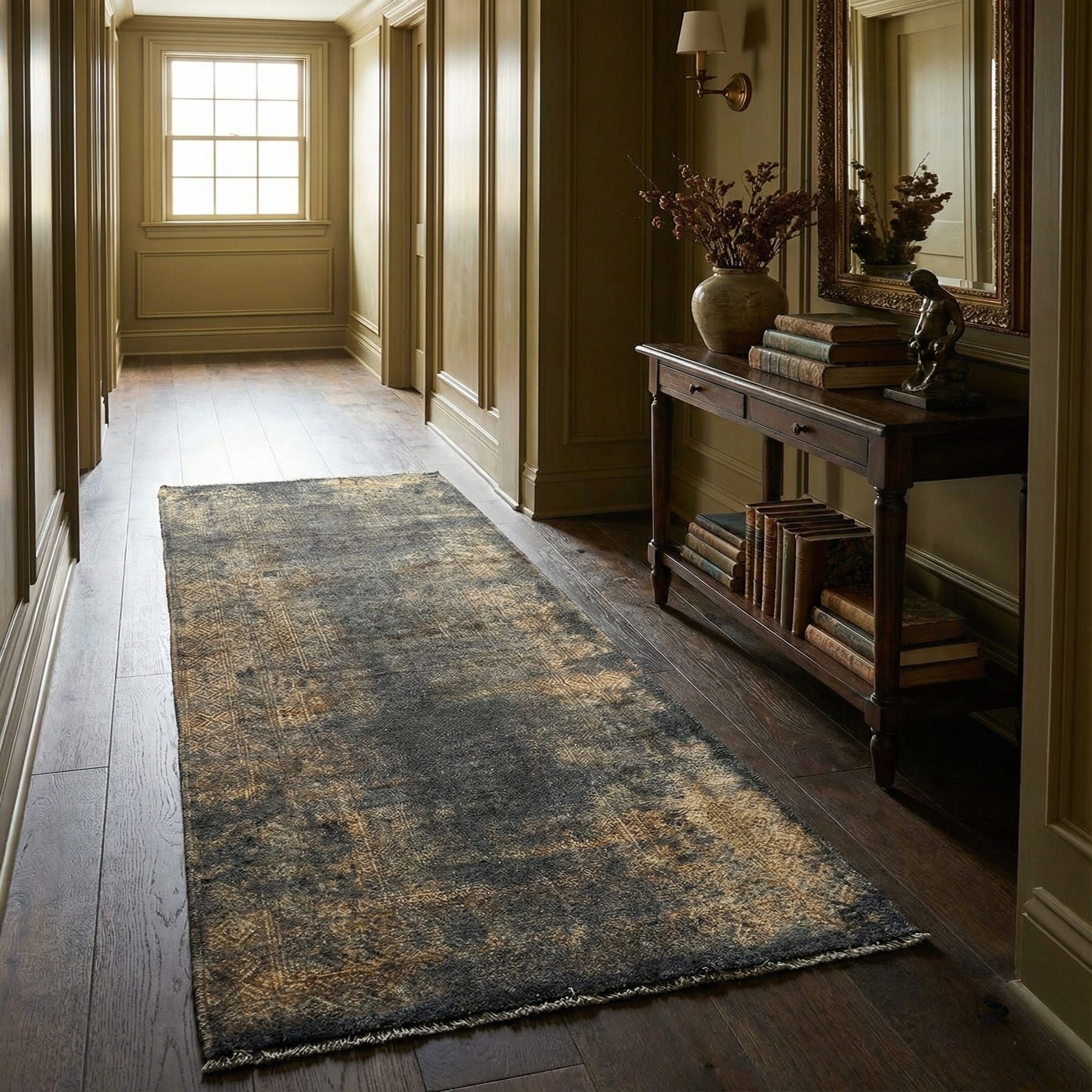 A 6 ft runner rug with a vintage tribal pattern in shades of grey and muted gold, suitable for a hallway.