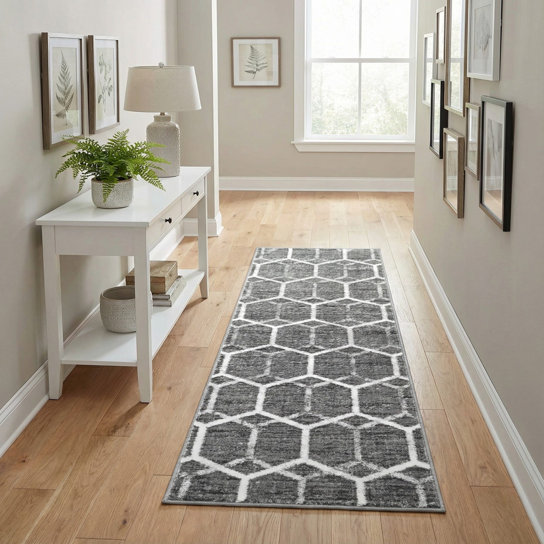 Works well as a hallway or entry runner, bringing clean lines to narrow spaces, or layered at the side of a bed to add a cozy, contemporary touch. It complements modern and transitional interiors alike—pair with warm wood tones and neutral upholstery for a lived-in look, or use with chrome, leather, and glass accents in an industrial or loft-style setting to reinforce a sleek, geometric aesthetic.