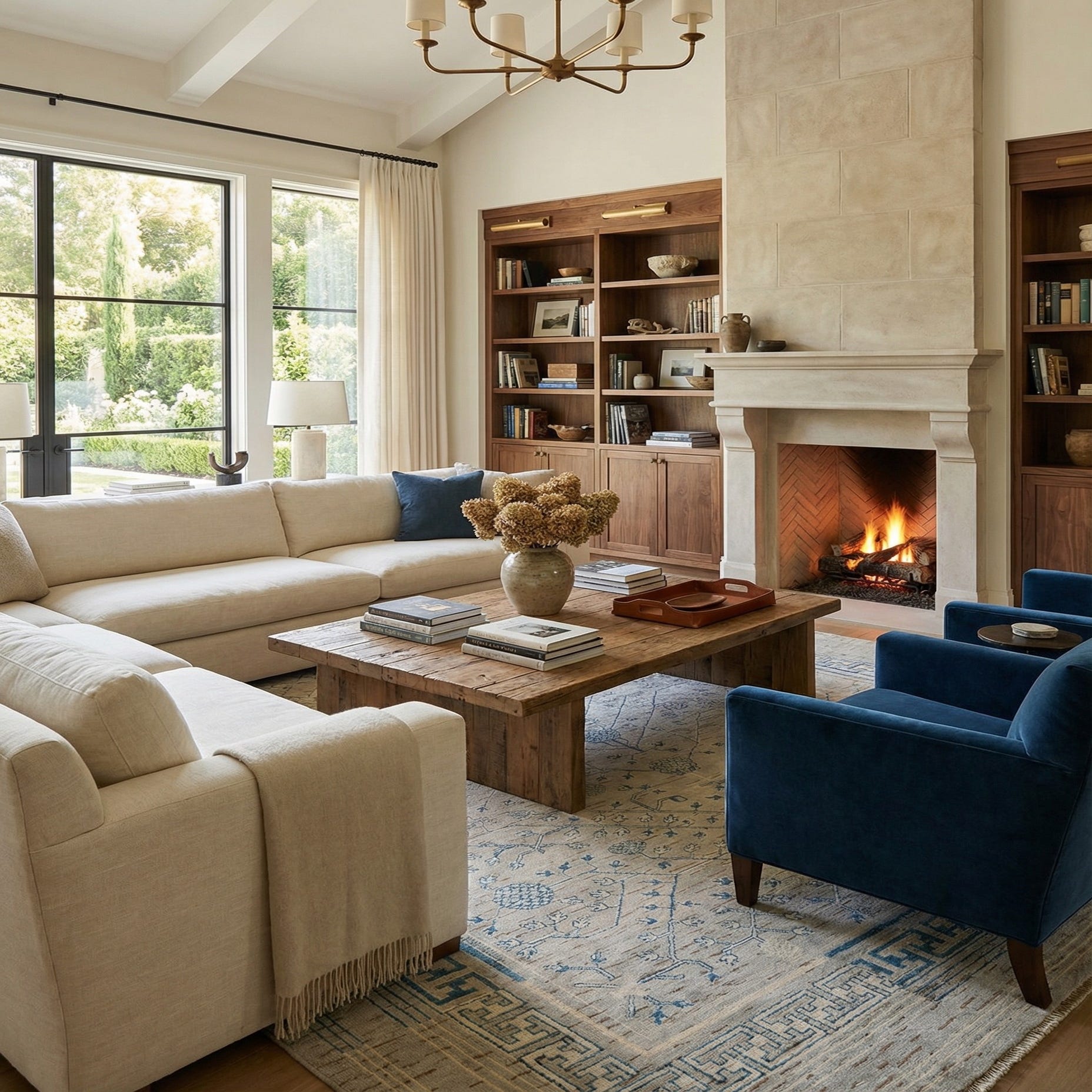 A 6x9 rectangular grey wool rug with a detailed blue tree-of-life pattern and a geometric border.