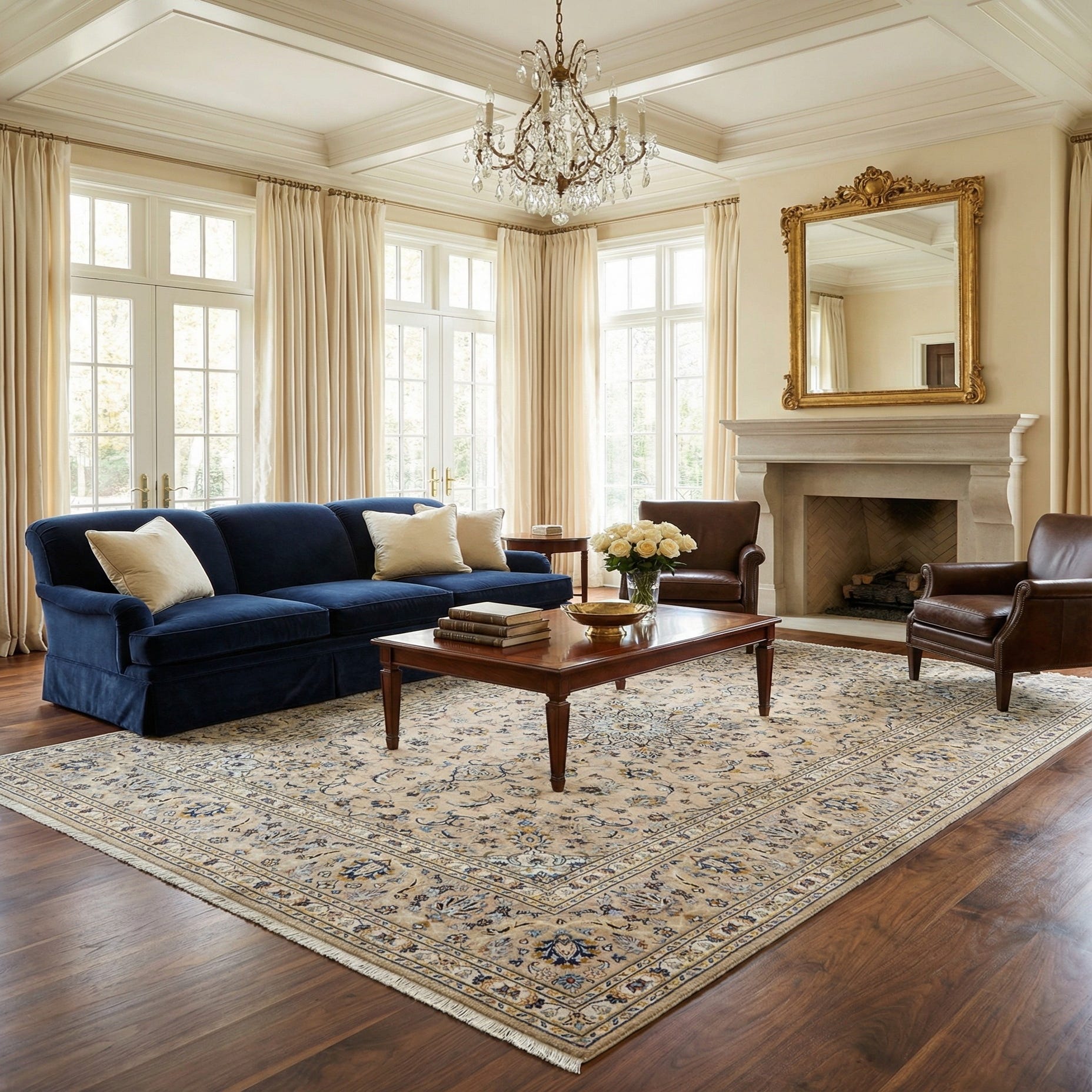 Works well in a range of interiors: place it beneath a sofa and coffee table to anchor a classic living room, slide it under a dining table to add pattern without overpowering, or layer it in a bedroom to introduce color and texture against neutral bedding. The grey base pairs cleanly with navy or charcoal upholstery and warms easily alongside medium to dark wood furniture and brass or matte-metal accents. Its balance of traditional patterning and muted color palette also complements transitional and modern-classic schemes that blend antique pieces with contemporary furnishings.